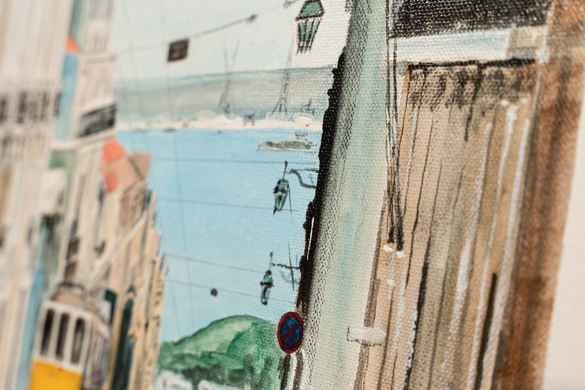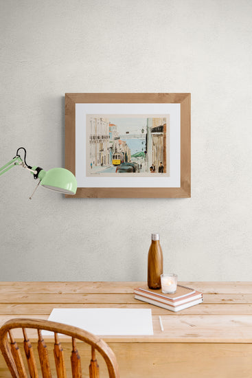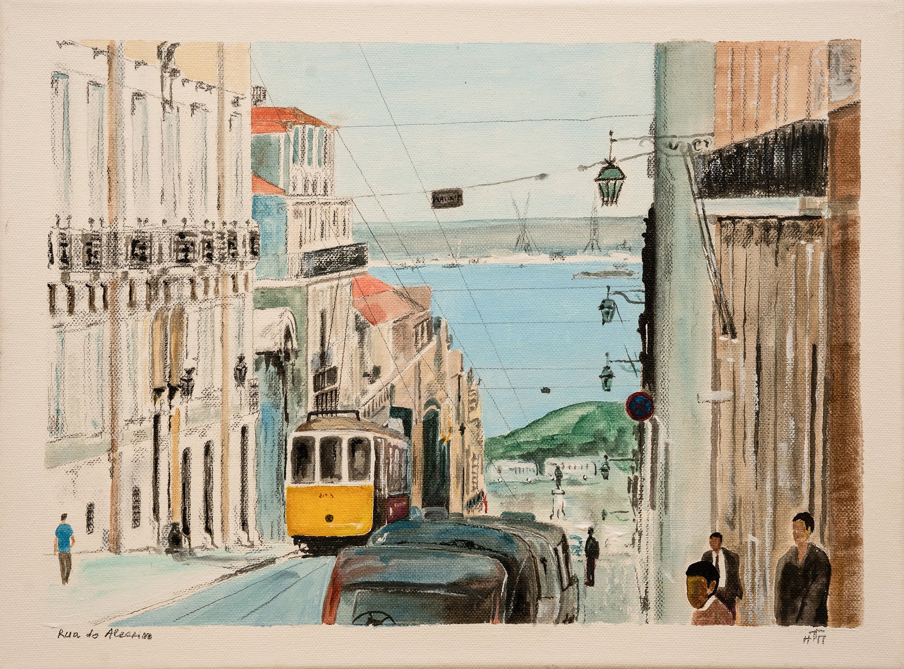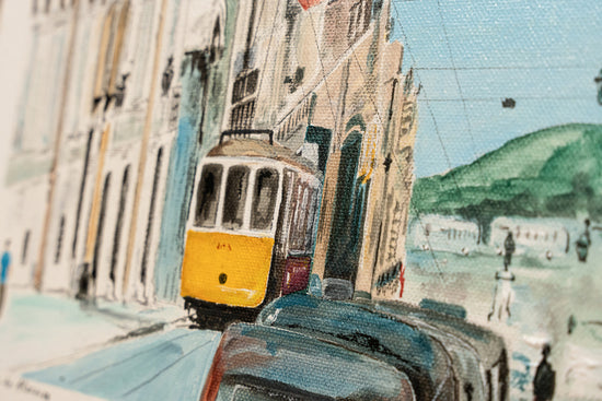 A timeless scene on "Rua do Alecrim" where a classic tram meanders through the historic street, flanked by traditional architecture and opening to a distant seascape.