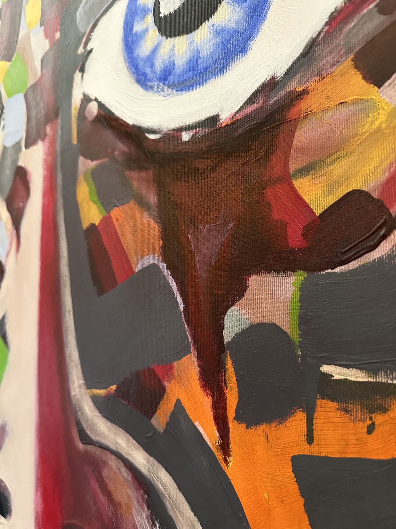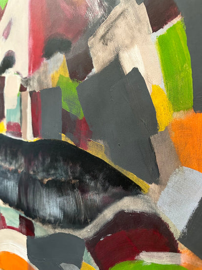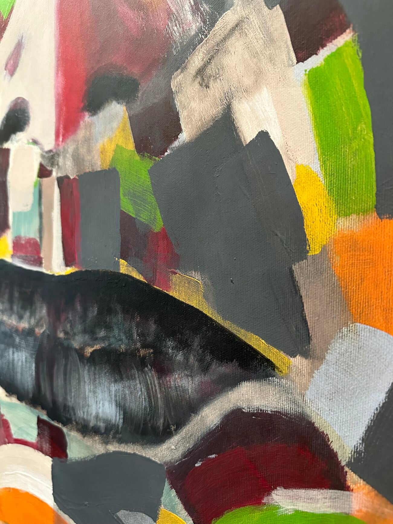 The juxtaposition of the vibrant, fragmented facial features with the dark, solid areas of the hair and clothing creates a striking visual dichotomy, inviting reflection on the complexity and multifaceted nature of identity.