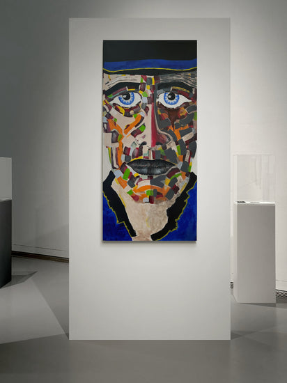 The subject's hair and suit are painted in broad, black brushstrokes, framing the vividly hued puzzle pieces that come together to form the face.