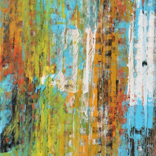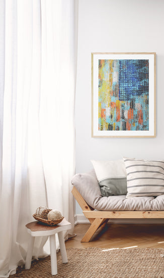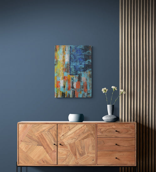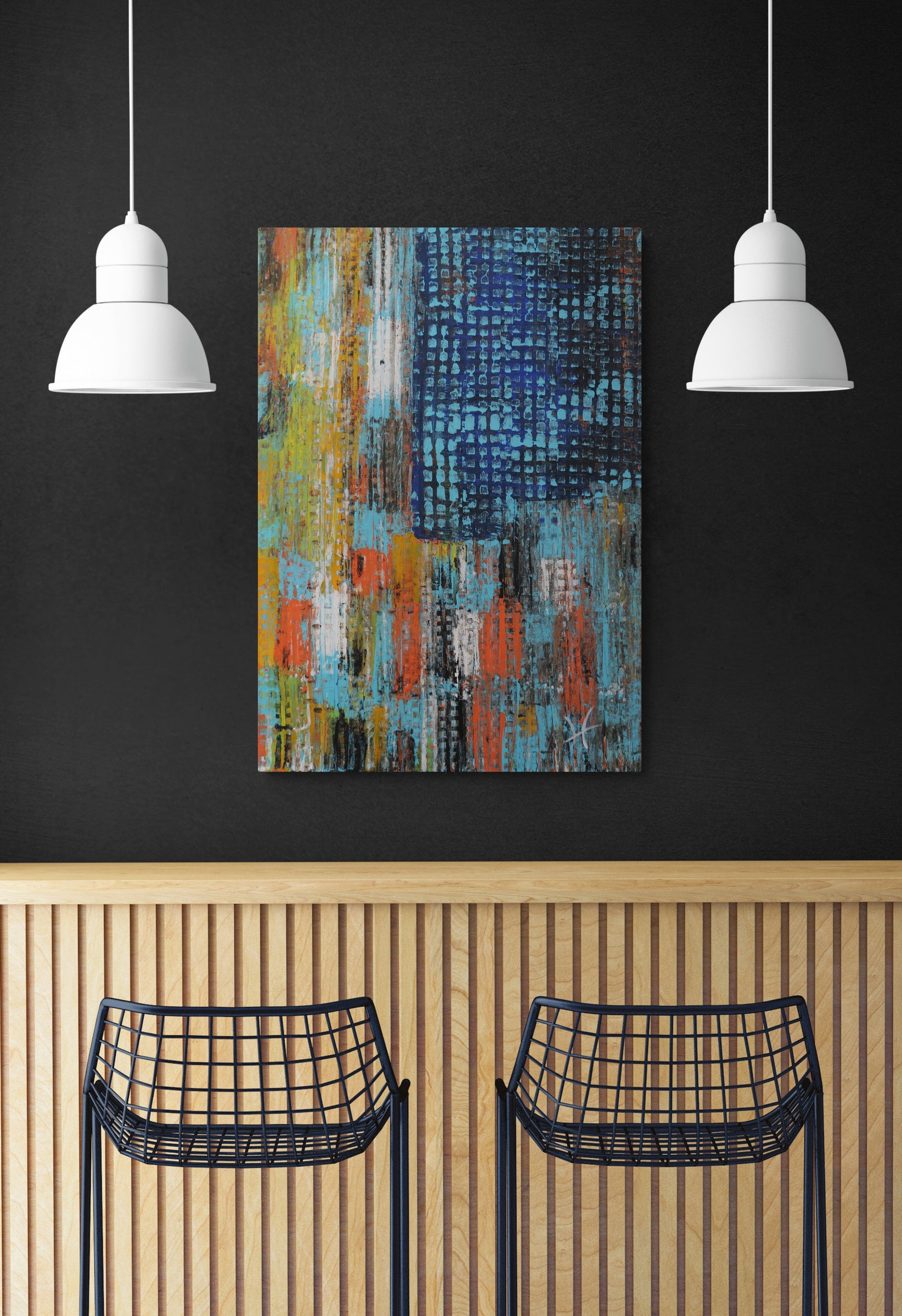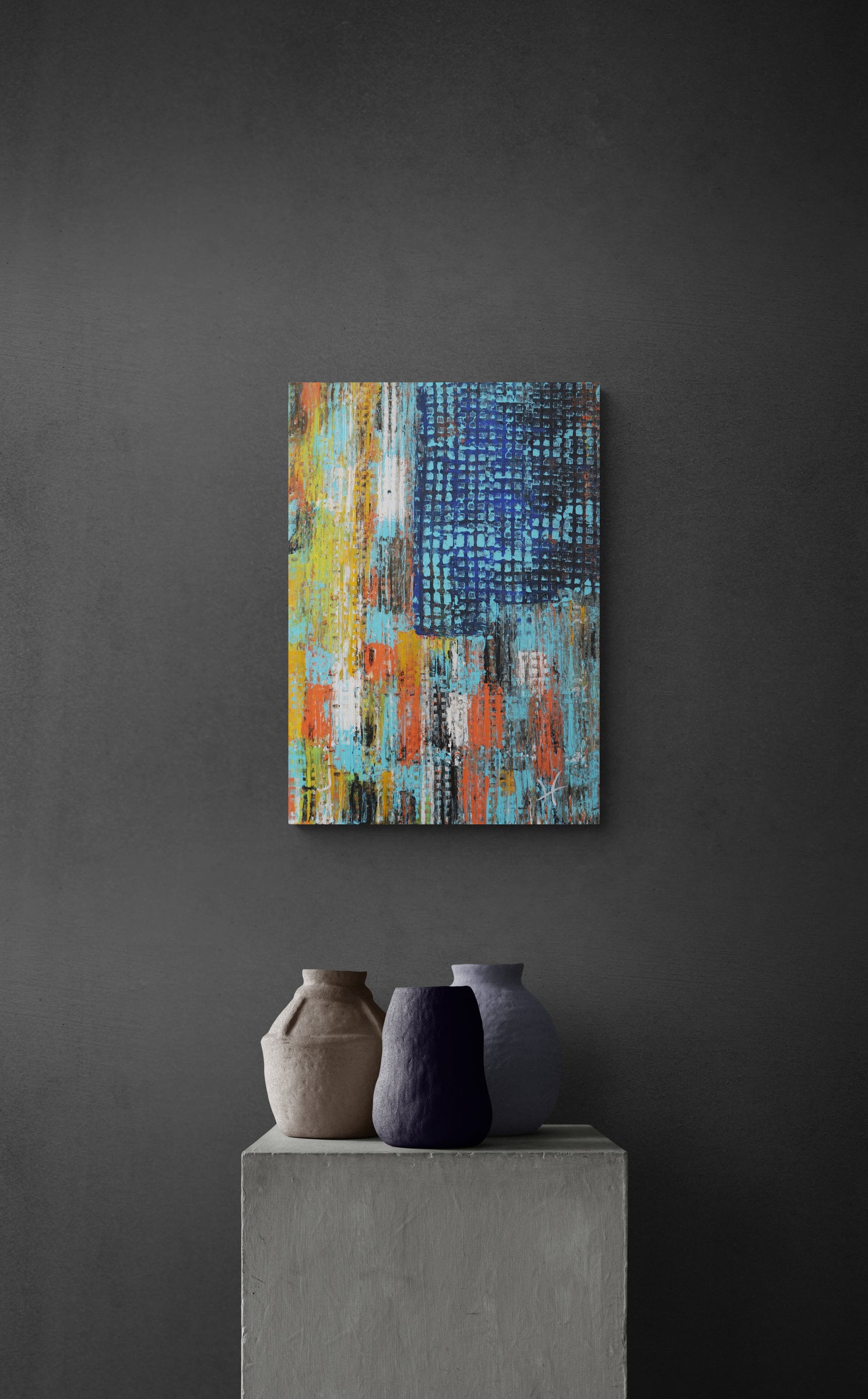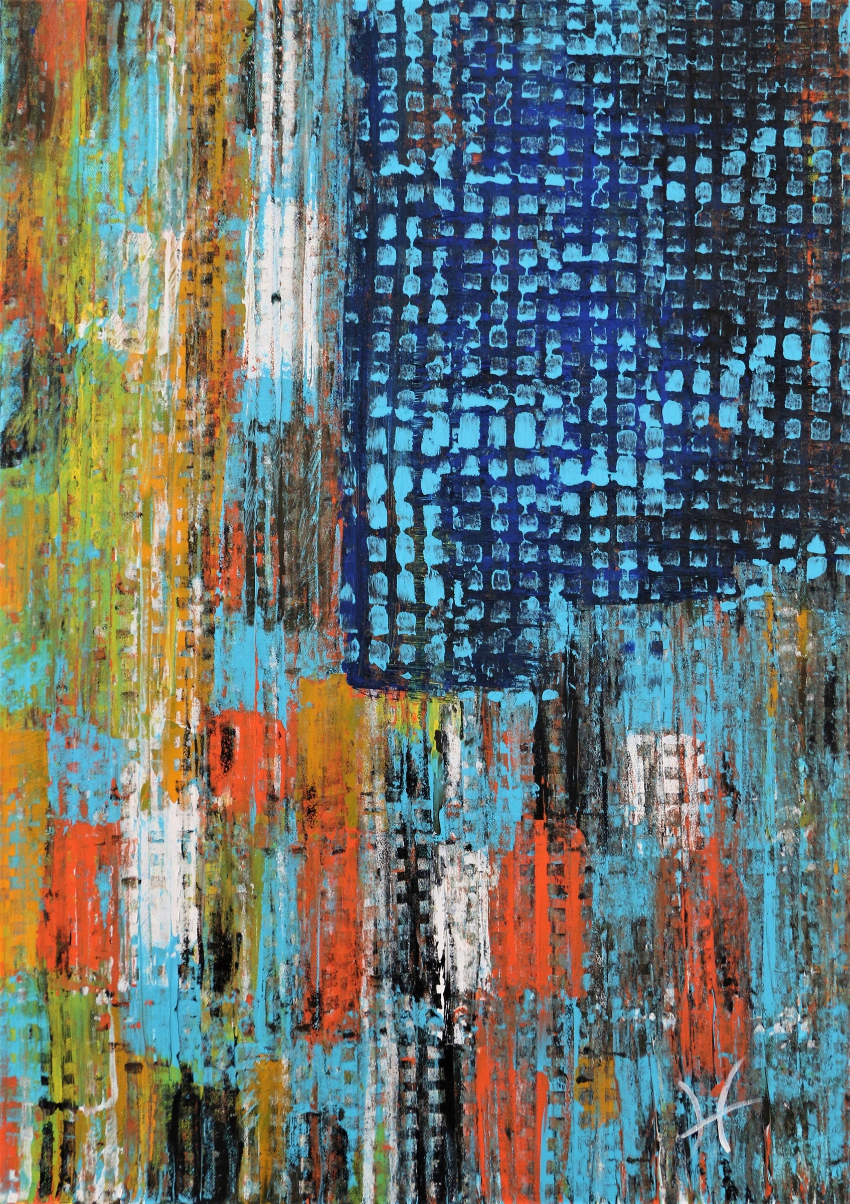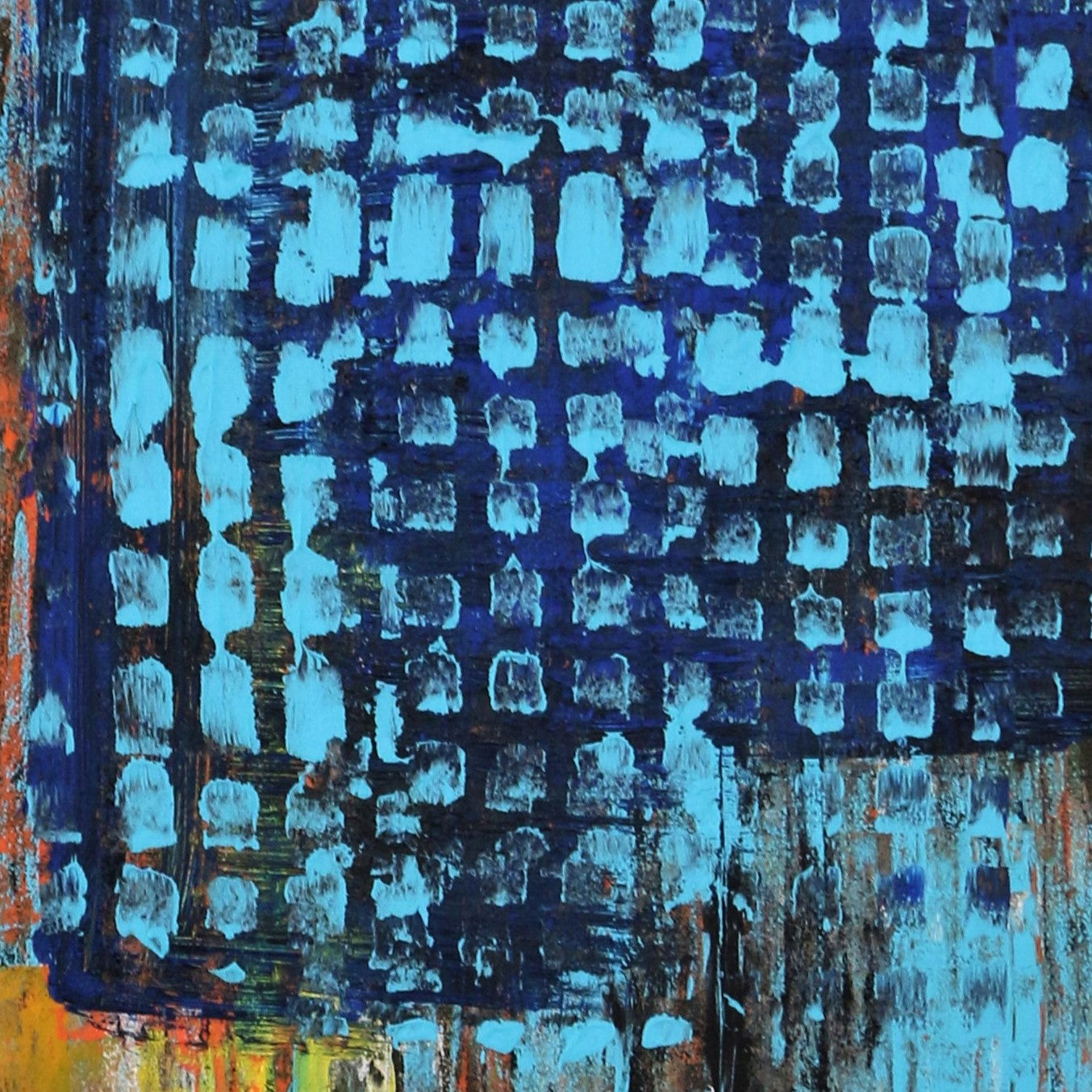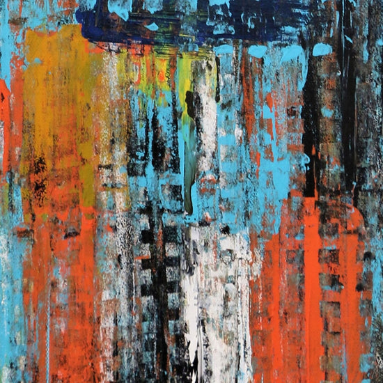 An abstract painting that captures the essence of urban textures through layered grids, bold colors, and textured brushstrokes. The interplay of vibrant orange, blue, and hints of green gives a sense of the chaotic yet organized nature of cityscapes.
