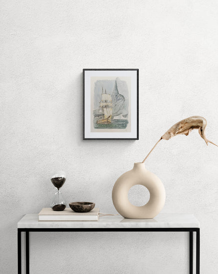 This detailed watercolor and pen sketch portrays a majestic tall ship navigating the waters beneath towering cliffs. The interplay between the ship's delicate sails and the imposing natural landscape behind it creates a striking contrast, emphasizing both the grandeur of the environment and the resilience of the vessel. The soft blue and grey tones of the mountains and sea are offset by the warm, earthy hues of the ship, drawing the viewer’s eye toward the meticulous craftsmanship of the boat's rigging and sails. The vast cliff face adds a sense of scale, making this a captivating piece for those drawn to the beauty of maritime exploration and untamed nature.