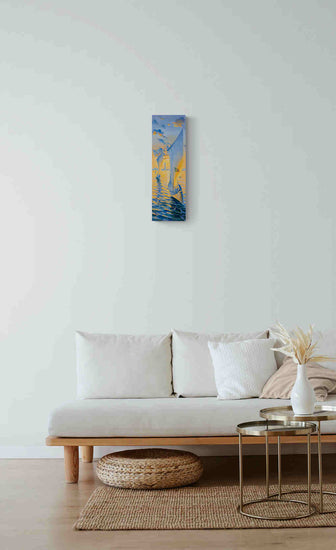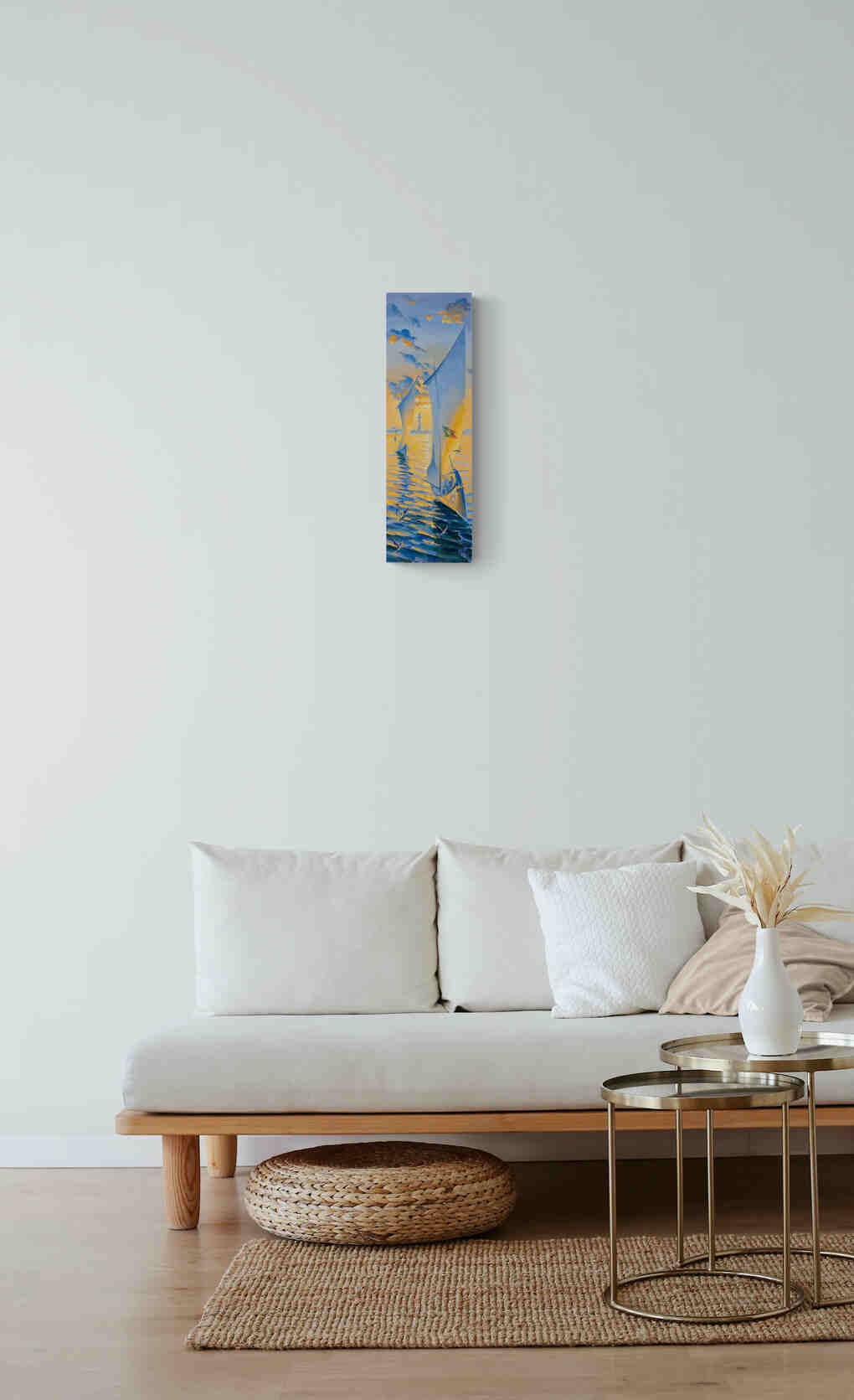 "Sails at Sunset" is a breathtaking oil painting that captures the serene beauty of a sailboat journey at dusk. The sails, bathed in the warm glow of the setting sun, reflect a radiant spectrum of oranges and yellows, which contrast strikingly against the cool blues of the sky and sea. The artist has skillfully depicted the lighthouse in the distance as a beacon of guidance, while seagulls dance around the boat, adding a dynamic element to the peaceful scene. This artwork is a tribute to the quiet majesty of the sea and the tranquil end of a day.