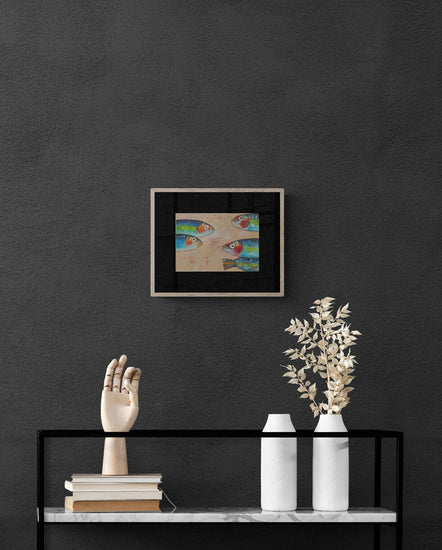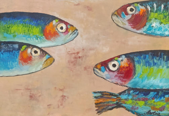 This oil painting on paper is a playful and colorful depiction of sardines. Anastasia Antia once again employs vibrant hues of blues, greens, reds, and oranges to bring these fish to life. The sardines' exaggerated, expressive eyes give the composition a whimsical touch, while the minimalistic, muted background in beige keeps the focus on the fish. The arrangement of the sardines creates a sense of interaction, as though they are curiously observing their surroundings, adding a dynamic quality to the artwork.