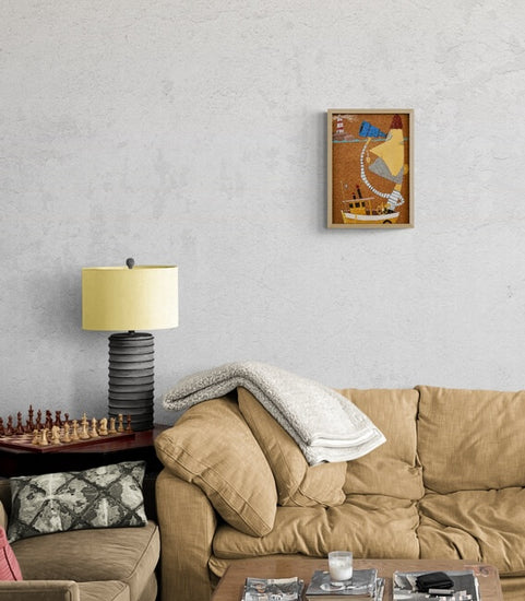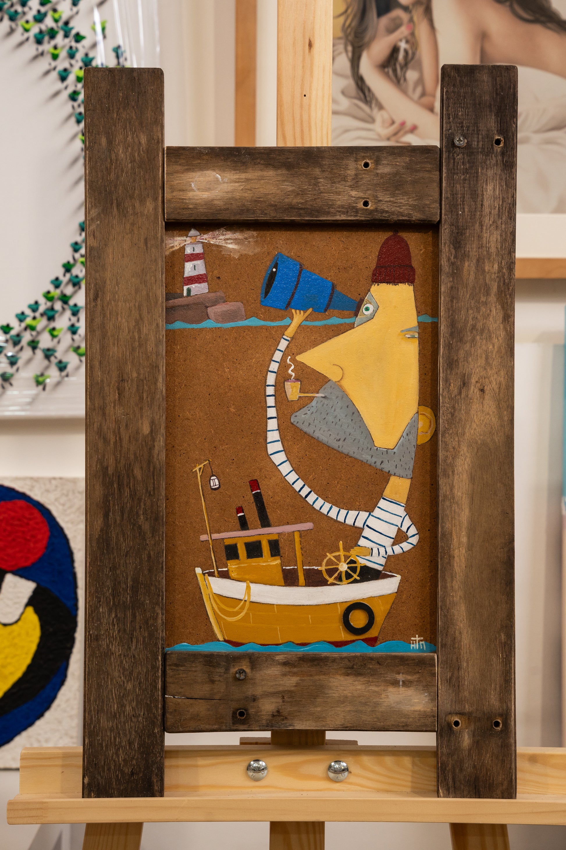 This imaginative piece titled "Seafarer’s Watch" shows a quirky character in a striped outfit operating a telescope, overlooking a small boat. Set against a cork backdrop, this painting merges whimsy with a seafaring theme, highlighting the artist’s playful approach to subjects connected with the ocean and exploration.