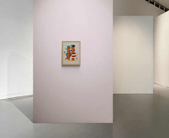"Seaside Embrace" features a tender moment between two characters on a beach. Dressed in vintage swimsuits and holding hands, their silhouettes form a heart shape, symbolizing their affection. The soft, sandy background and a distant colorful umbrella set a cheerful, nostalgic scene. This artwork captures the essence of summer love with a touch of whimsy.