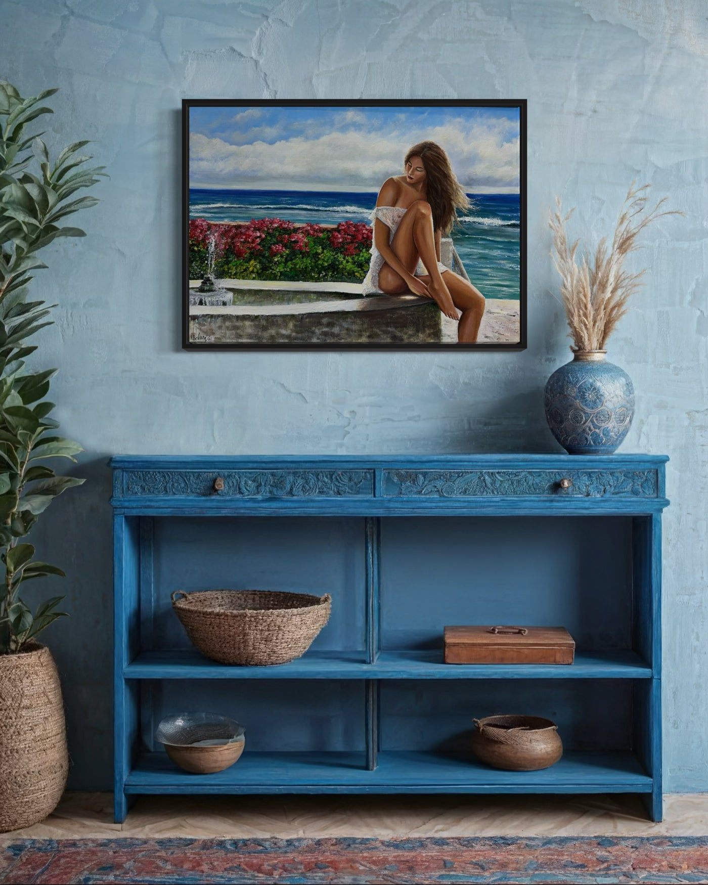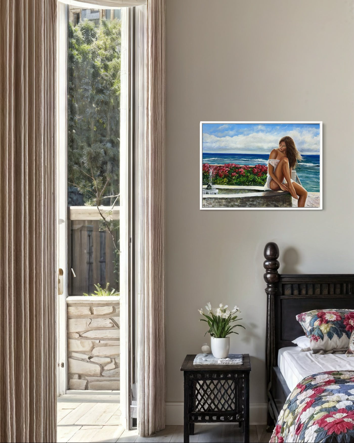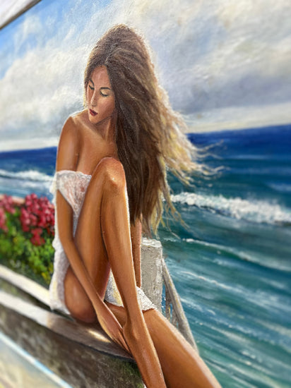 A peaceful, realistic portrayal of a young woman sitting thoughtfully beside a fountain, framed by blooming flowers and the expansive ocean in the background.