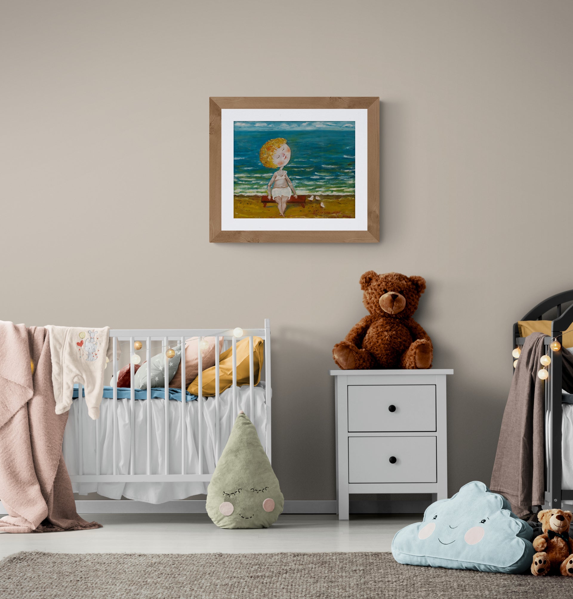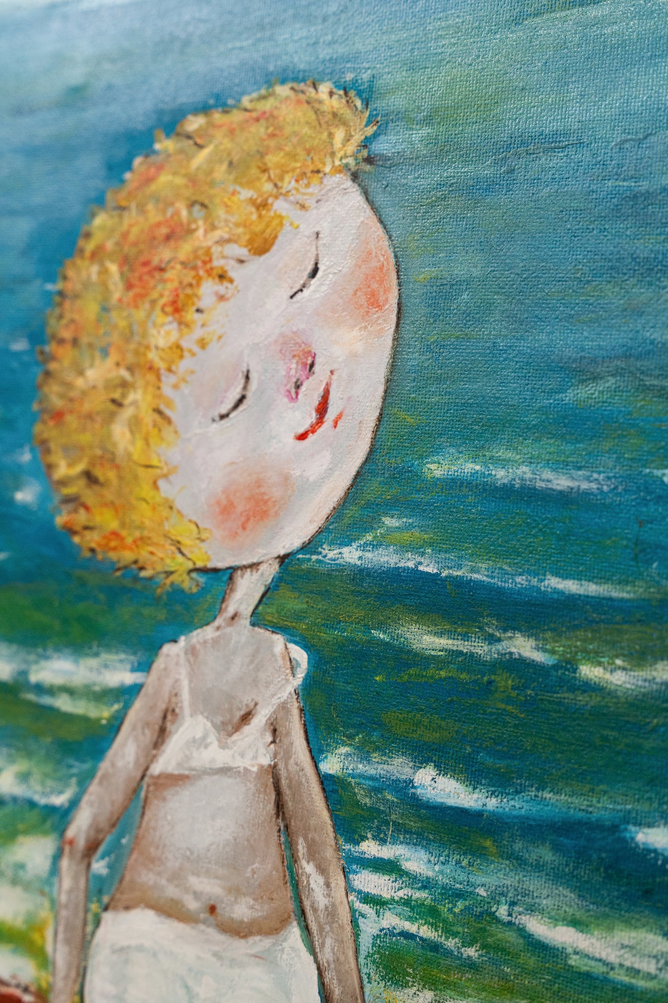 This whimsical painting features a stylized figure sitting contentedly on a bench by the sea, with a playful depiction of the ocean and shore behind.