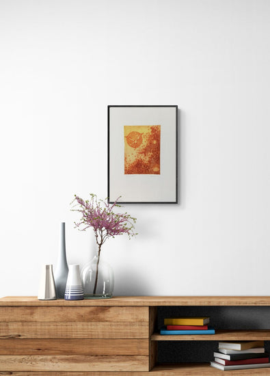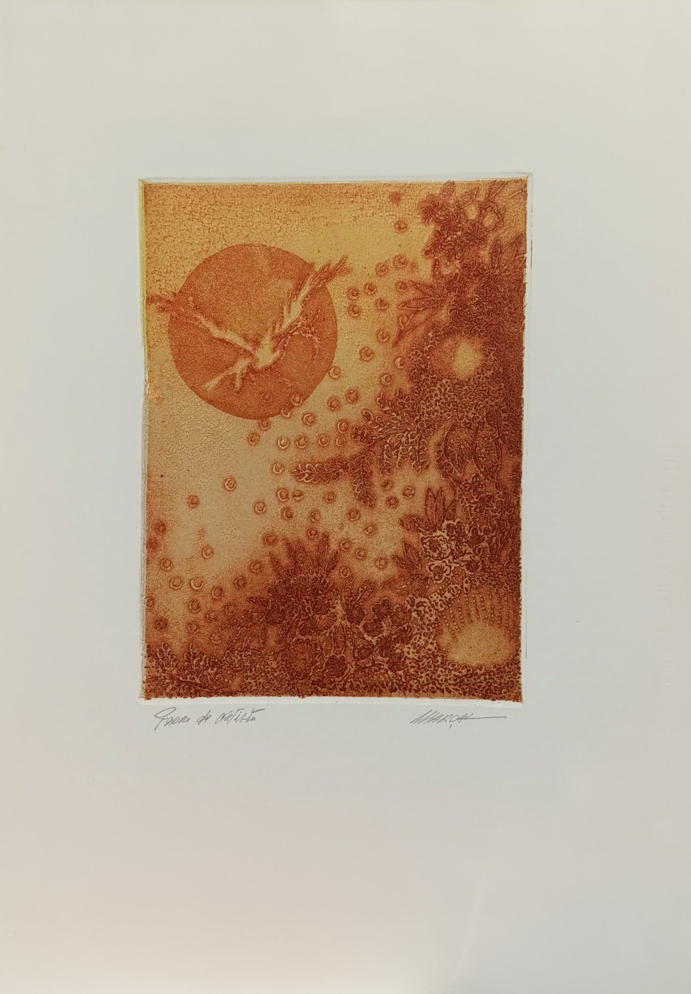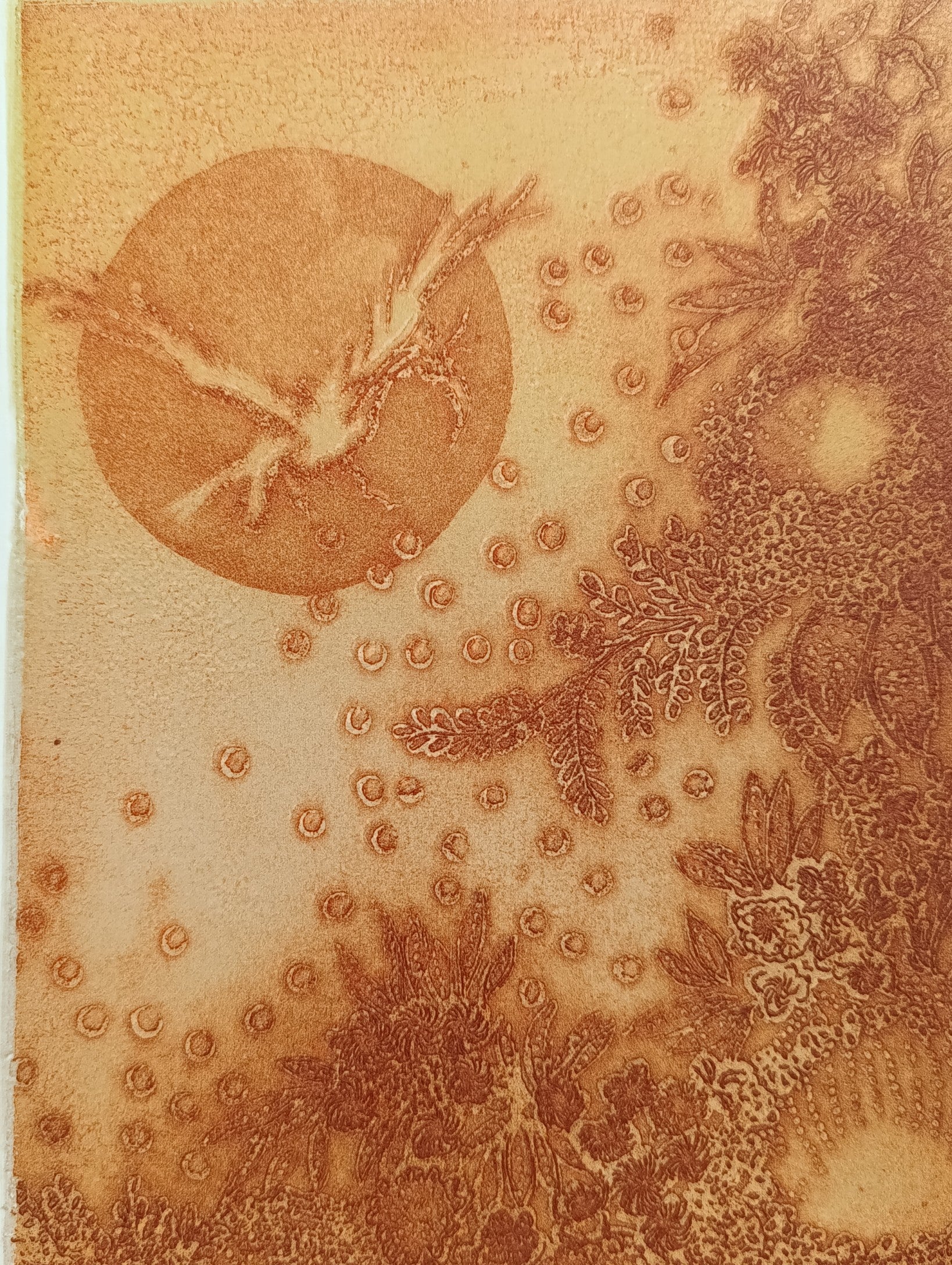 Dominated by a central image resembling a seed or cellular structure, the artwork is enveloped by intricate patterns that mimic natural textures and biological forms. The monochromatic sepia tone lends a timeless quality, while the detailed etching technique enhances the depth and intricacy of the composition. This piece invites viewers to ponder the complexity of nature and the interconnections within it.