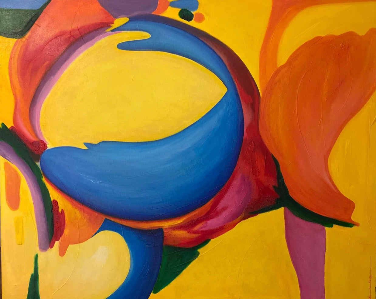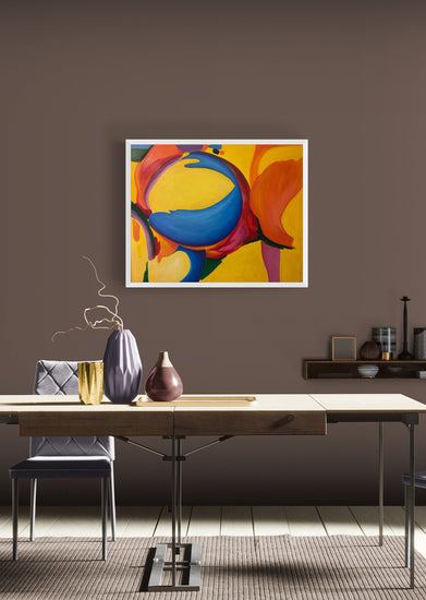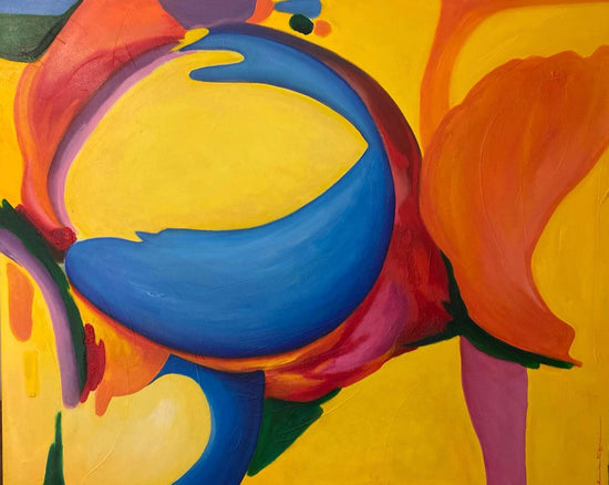 This striking abstract painting brings together bold swaths of color that interlock and swirl, reminiscent of natural forces or celestial bodies in motion. A deep, rich blue dominates the center of the composition, encircled by vibrant oranges and yellows, which seem to radiate outward. The organic shapes suggest a sense of movement, like an eclipse or planetary alignment, while the contrasting hues invoke feelings of energy and intensity. The use of curved lines and soft blending between colors creates a harmonious flow across the canvas, making it both dynamic and balanced.