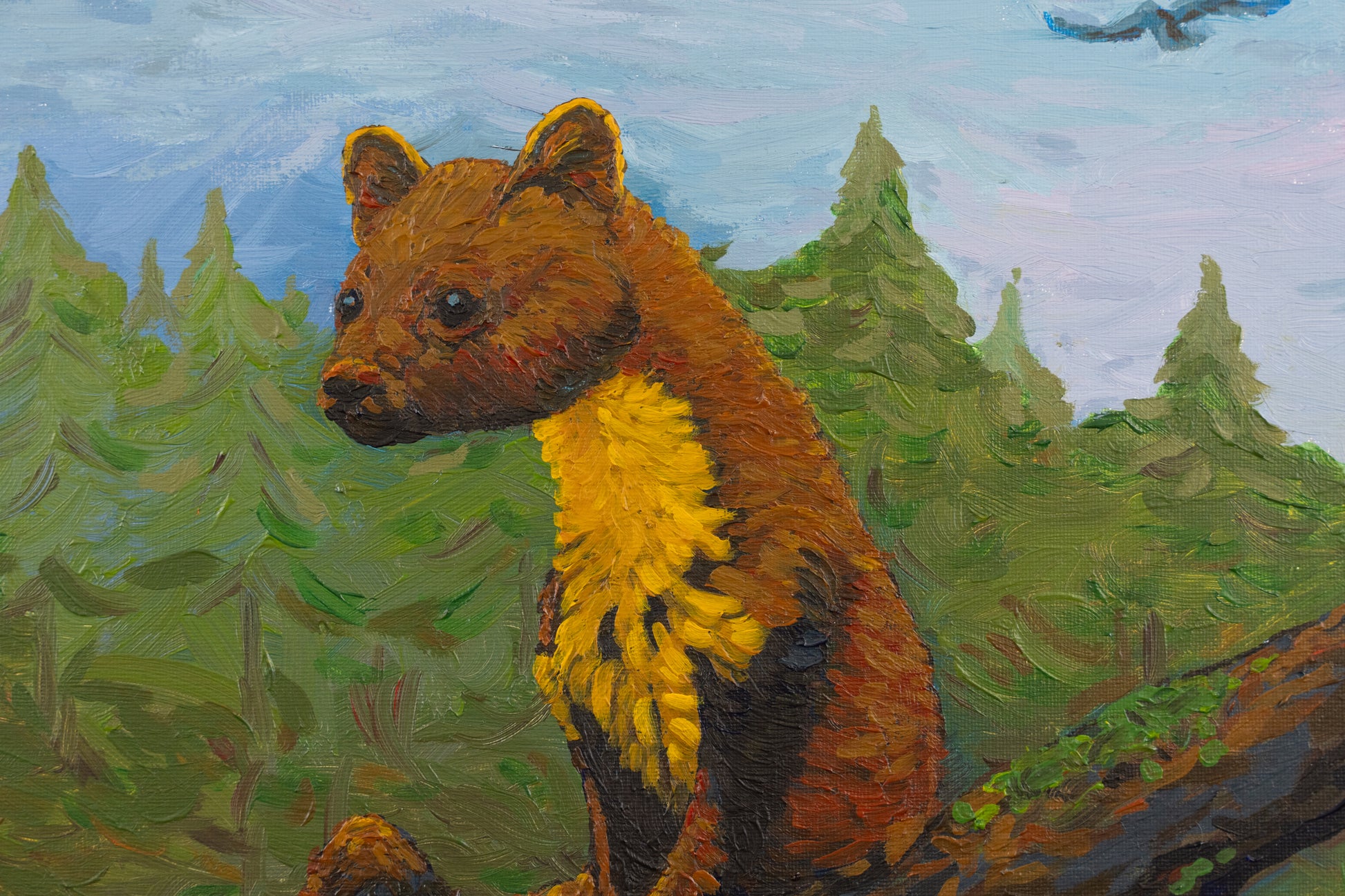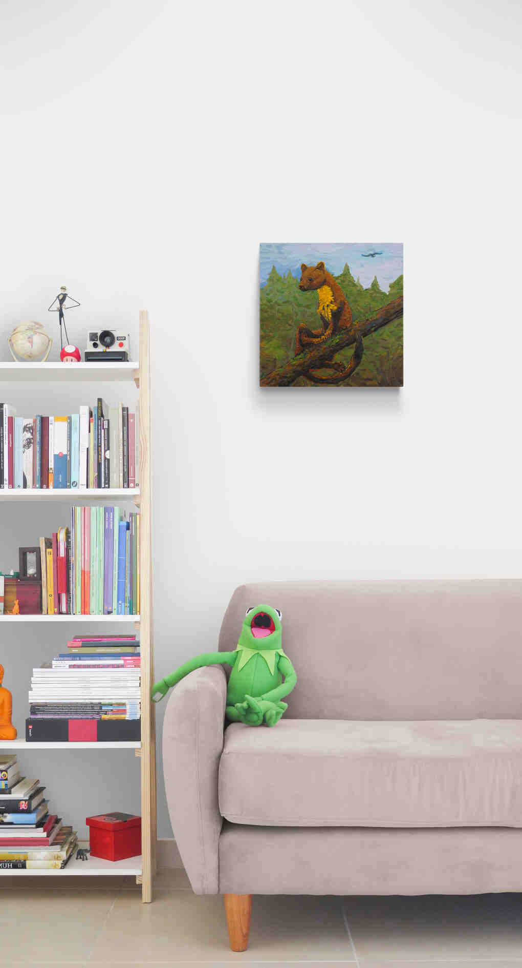Set against a serene forest backdrop, this painting features a contemplative marsupial perched on a branch. The artistry brings the scene to life with a harmonious blend of natural greens and browns, punctuated by the orange and yellow of the creature's fur. Employing a realist approach, the artist meticulously captures the textures of the animal's coat and the dense foliage of its habitat, creating a peaceful tableau that speaks to the tranquility and beauty of wildlife.