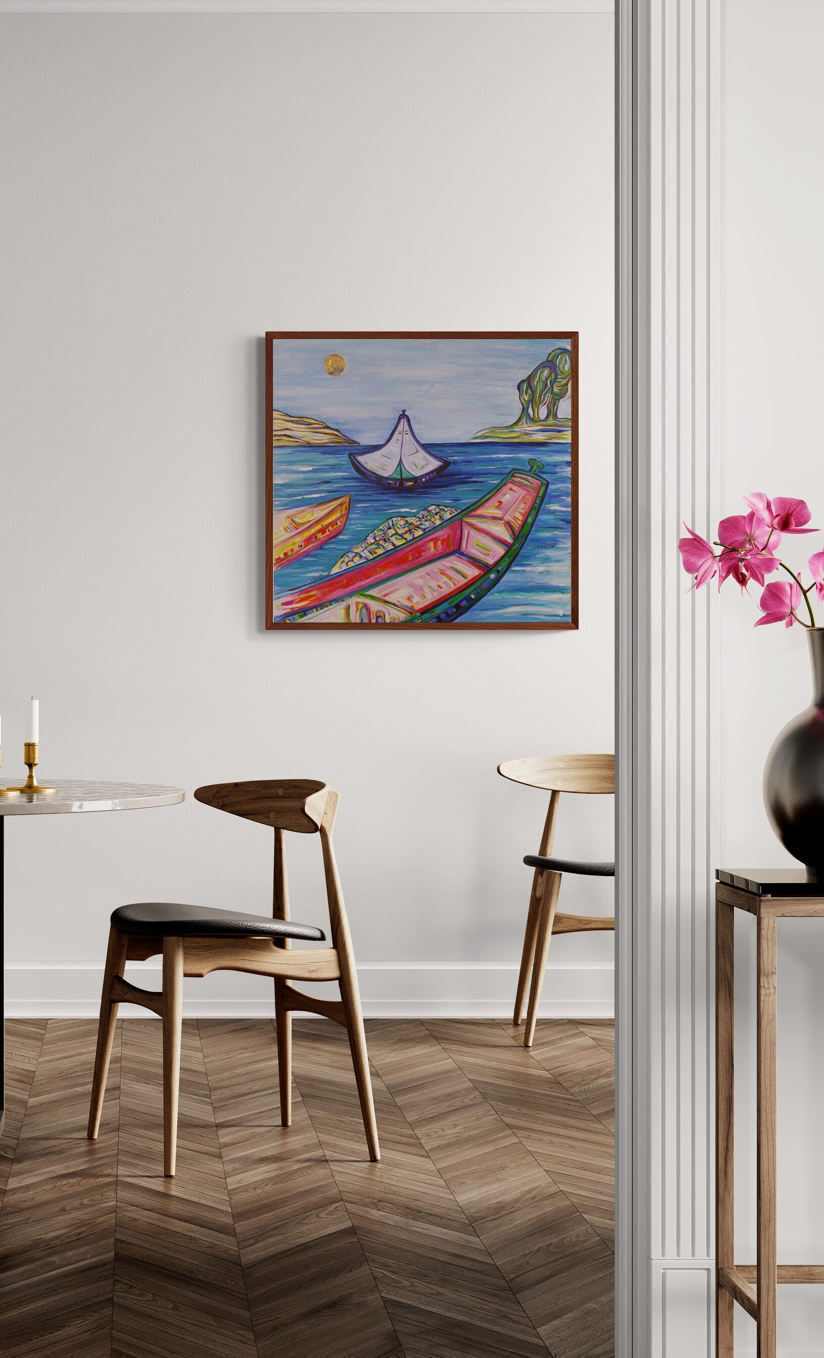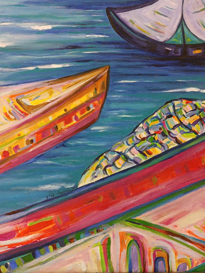 The foreground is dominated by intricately detailed boats with rich, warm tones of pink, red, and green, their angular shapes contrasting with the fluidity of the water. The sails of the central boat are painted in soft shades, hinting at a serene, peaceful voyage, while the rippling waters convey movement and tranquility. The distant shoreline with rolling hills and a tree adds depth, inviting the viewer to imagine the distant lands beyond the horizon. The golden sun hanging high above lends the painting a sense of magic and timelessness, emphasizing the harmony between nature and human life at sea.