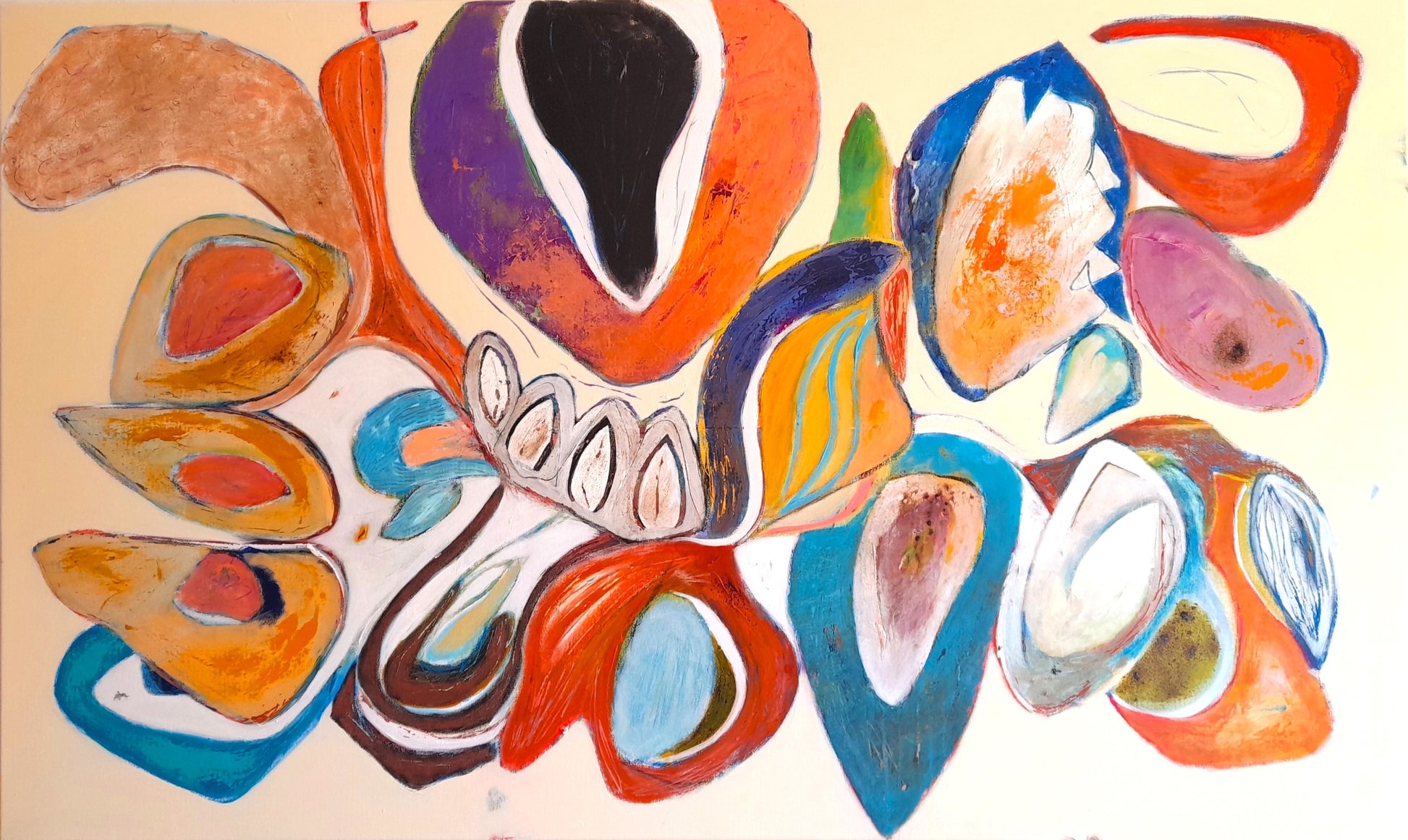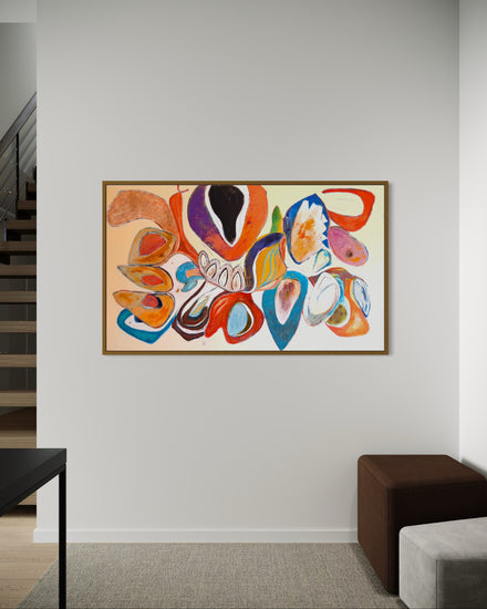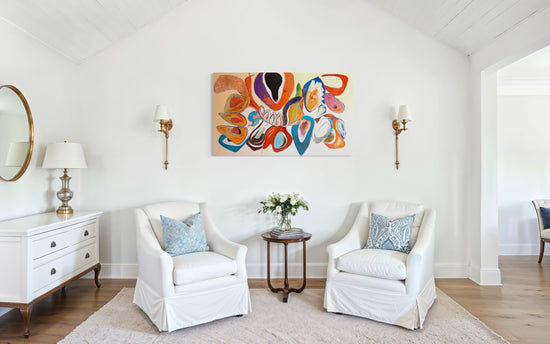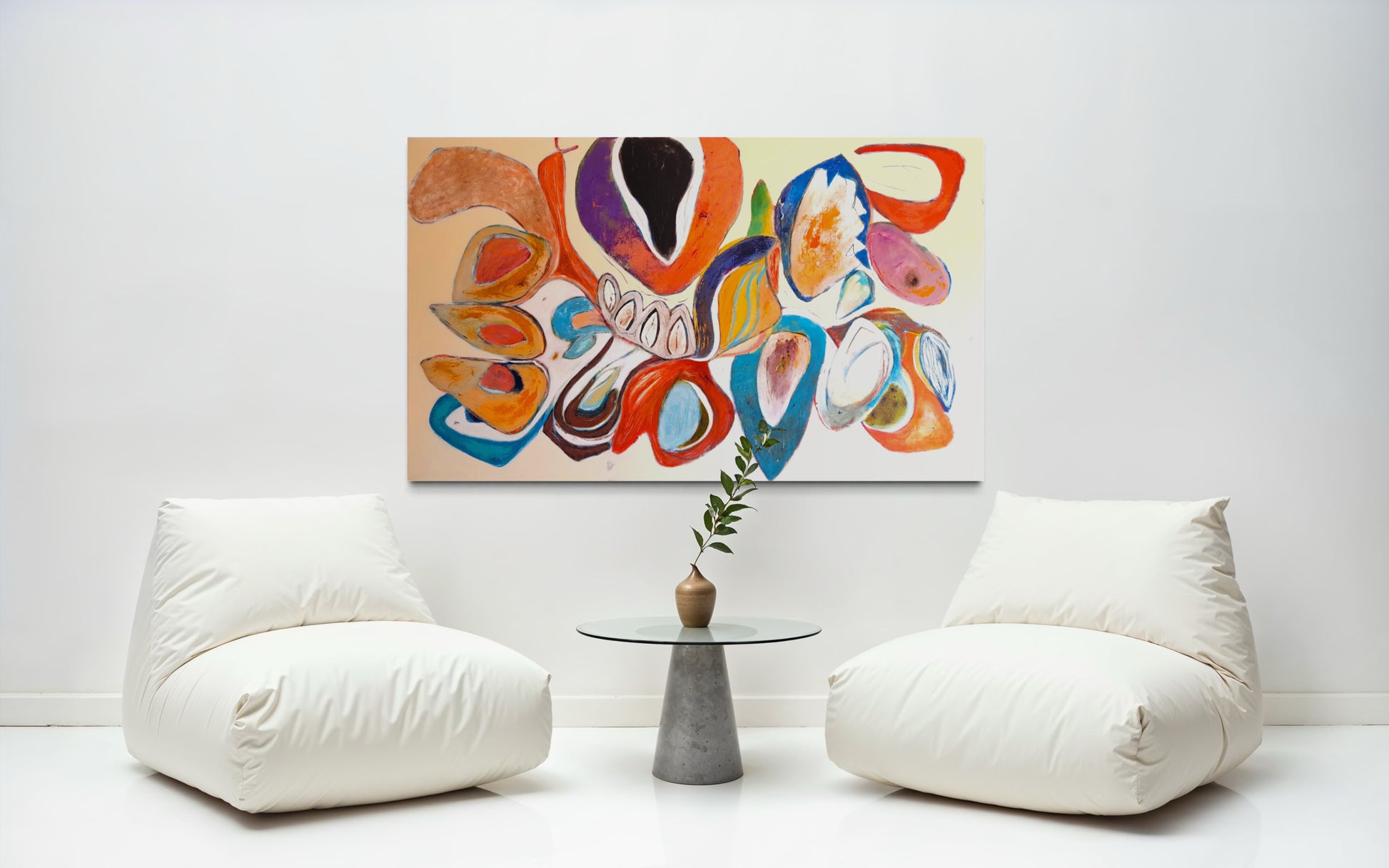 Serendipity II is a vibrant dance of organic shapes and spontaneous movement. Bold forms and bright pigments pulse across the canvas in a joyful celebration of unexpected harmony, inviting the viewer to find their own meaning in the chaos.