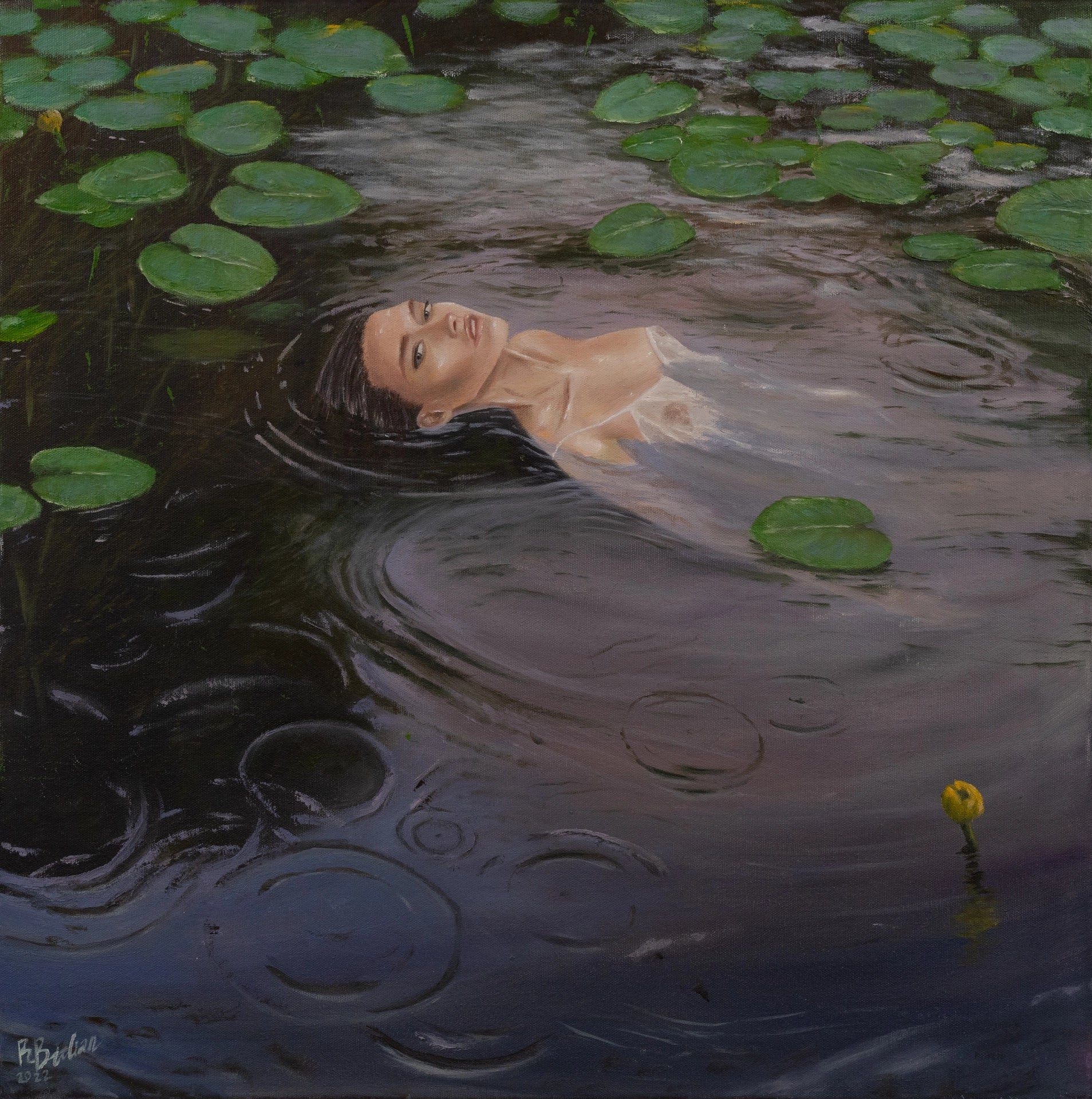 The scene captures a woman floating in a dark water pond, surrounded by lily pads.