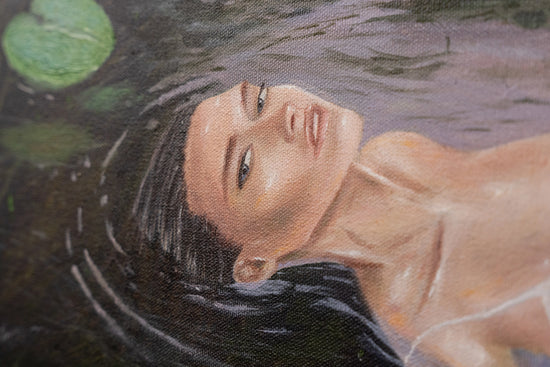 The reflection of light on the water is carefully rendered, showing the ripples around the serene figure, whose pose and expression evoke a sense of tranquility.