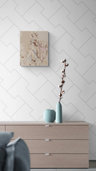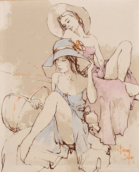 This artwork acrylic print on canvas captures a peaceful summer moment with two young women relaxing in the warmth of the sun. Both figures are dressed in light, flowing dresses and wide-brimmed hats, evoking a sense of timeless elegance and tranquility. The artist's use of delicate lines and soft pastel hues enhances the gentle and serene atmosphere of the scene.