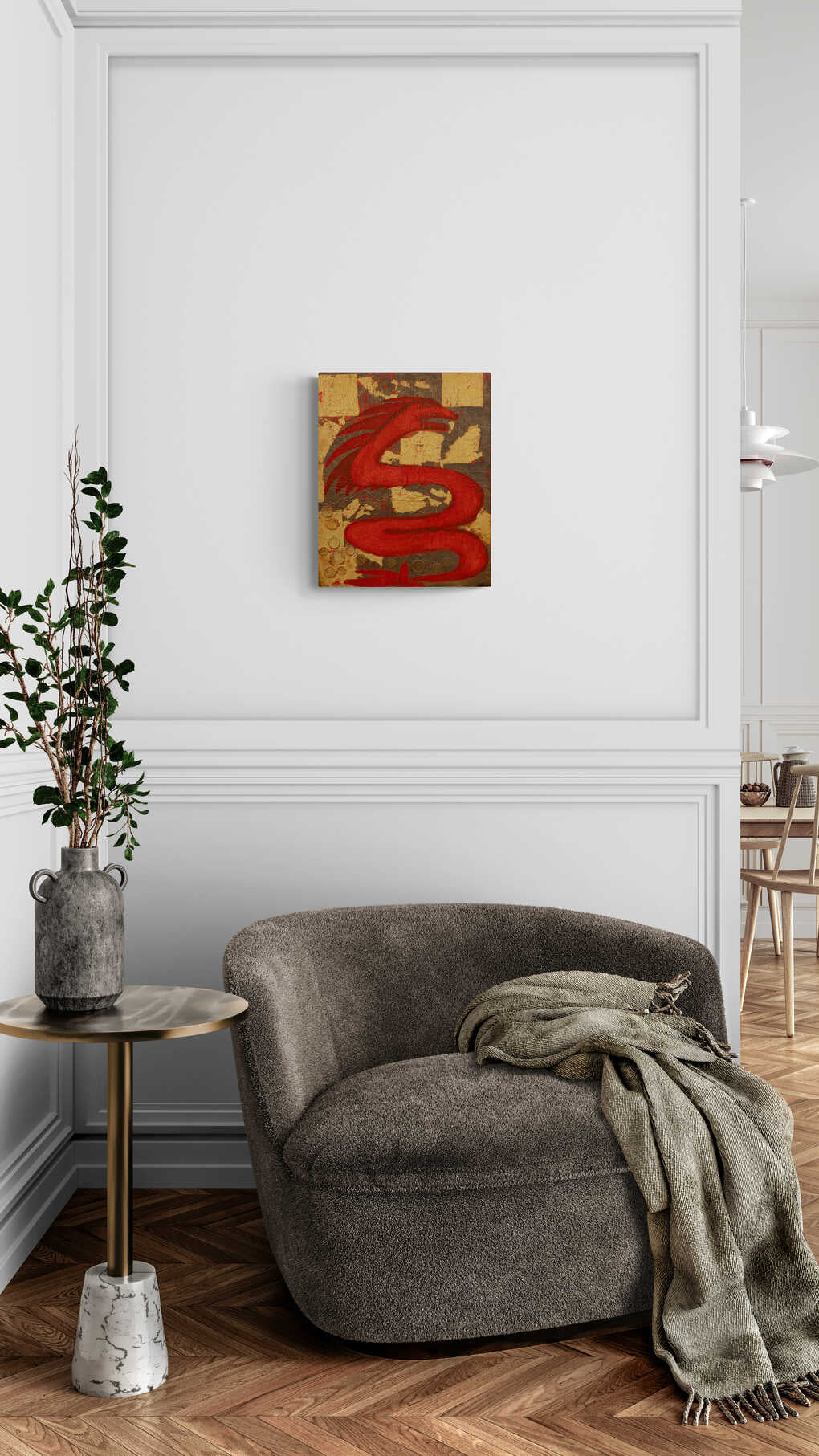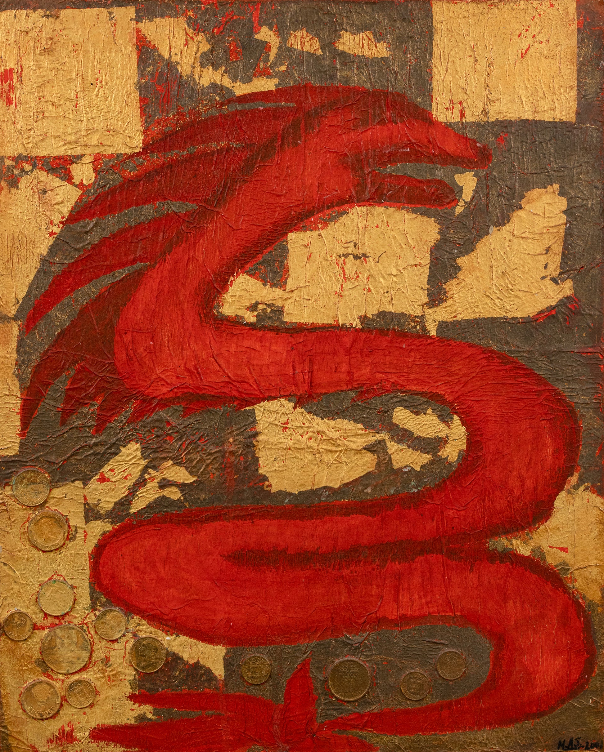 A bold, abstract representation of a dragon intertwined with geometric patterns. The use of red and gold textures creates a sense of depth and power.