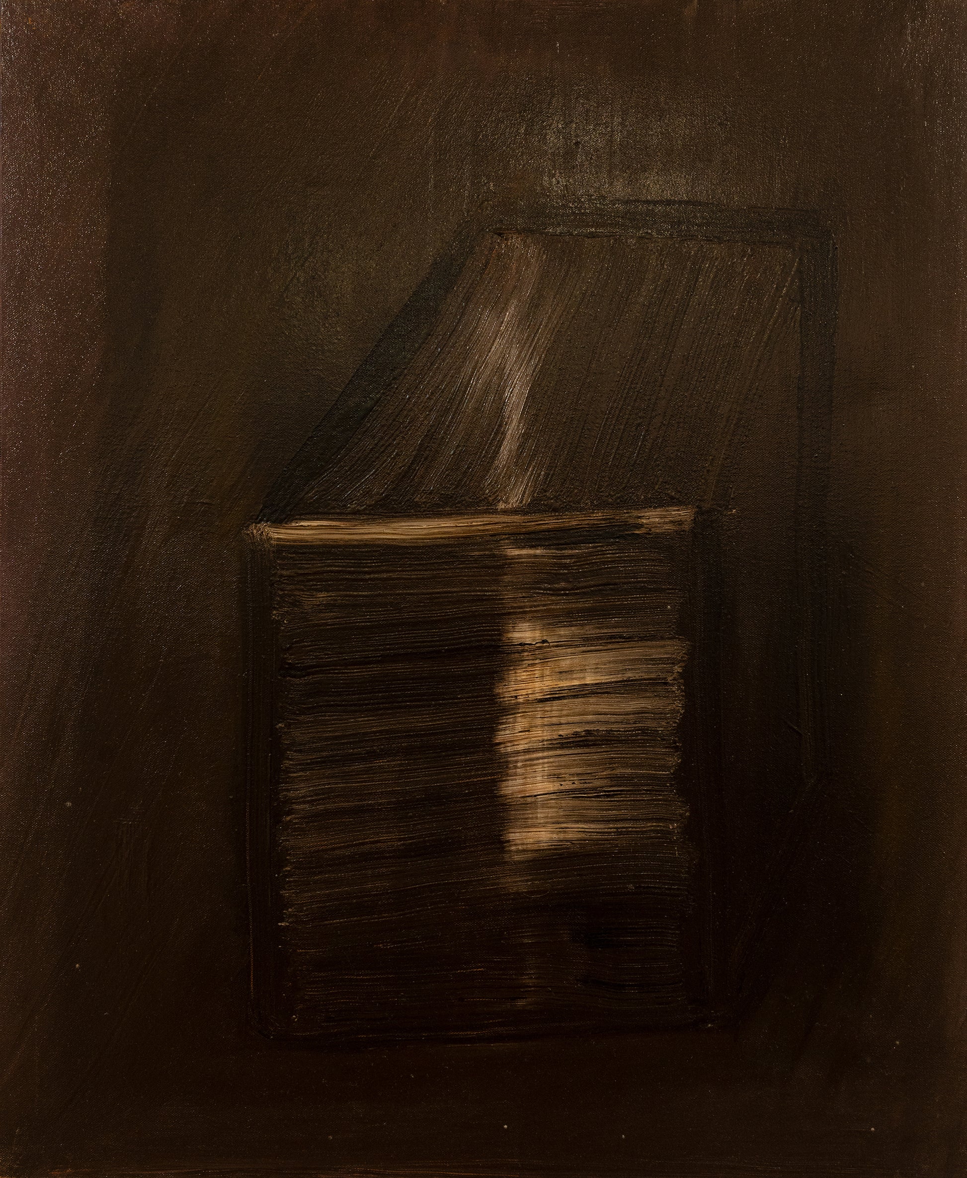 An abstract depiction of a dark, shadowed form against a brown background. The interplay of light and shadow, along with the textured brushstrokes, creates a mysterious and introspective atmosphere.