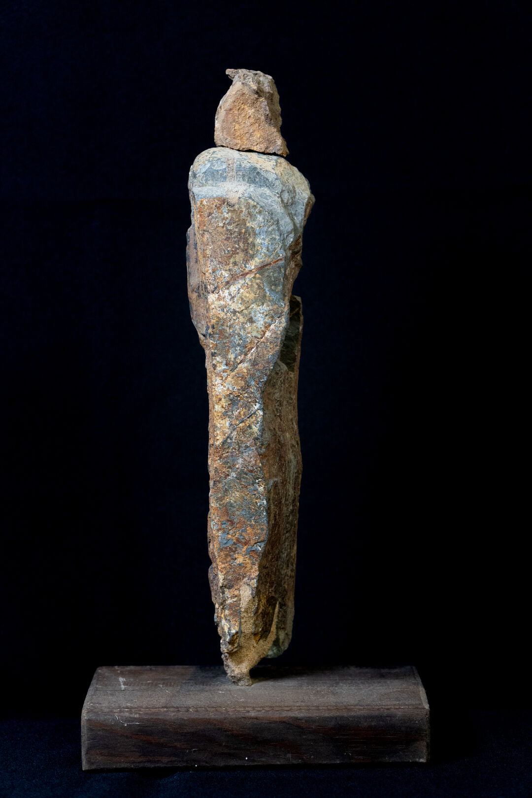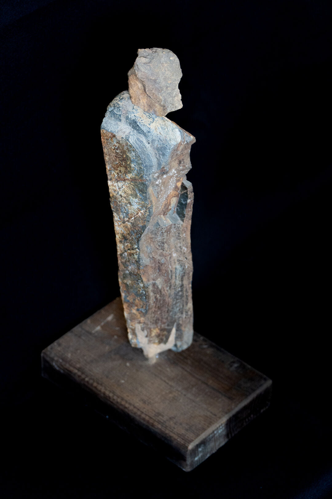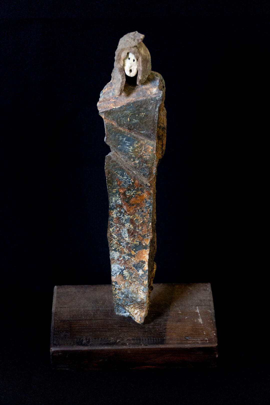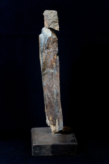 A mysterious, cloaked figure that seems to emerge from the stone itself, wrapped in an aura of silence and introspection. The rugged textures and earthy tones of the stone create an impression of timelessness, as though this figure has been a silent observer of countless epochs. Its obscured face and elongated form evoke an enigmatic presence, inviting viewers to consider the secrets and wisdom this ancient form might hold. This piece resonates with themes of solitude and quiet strength, embodying a spirit connected deeply with the elements.