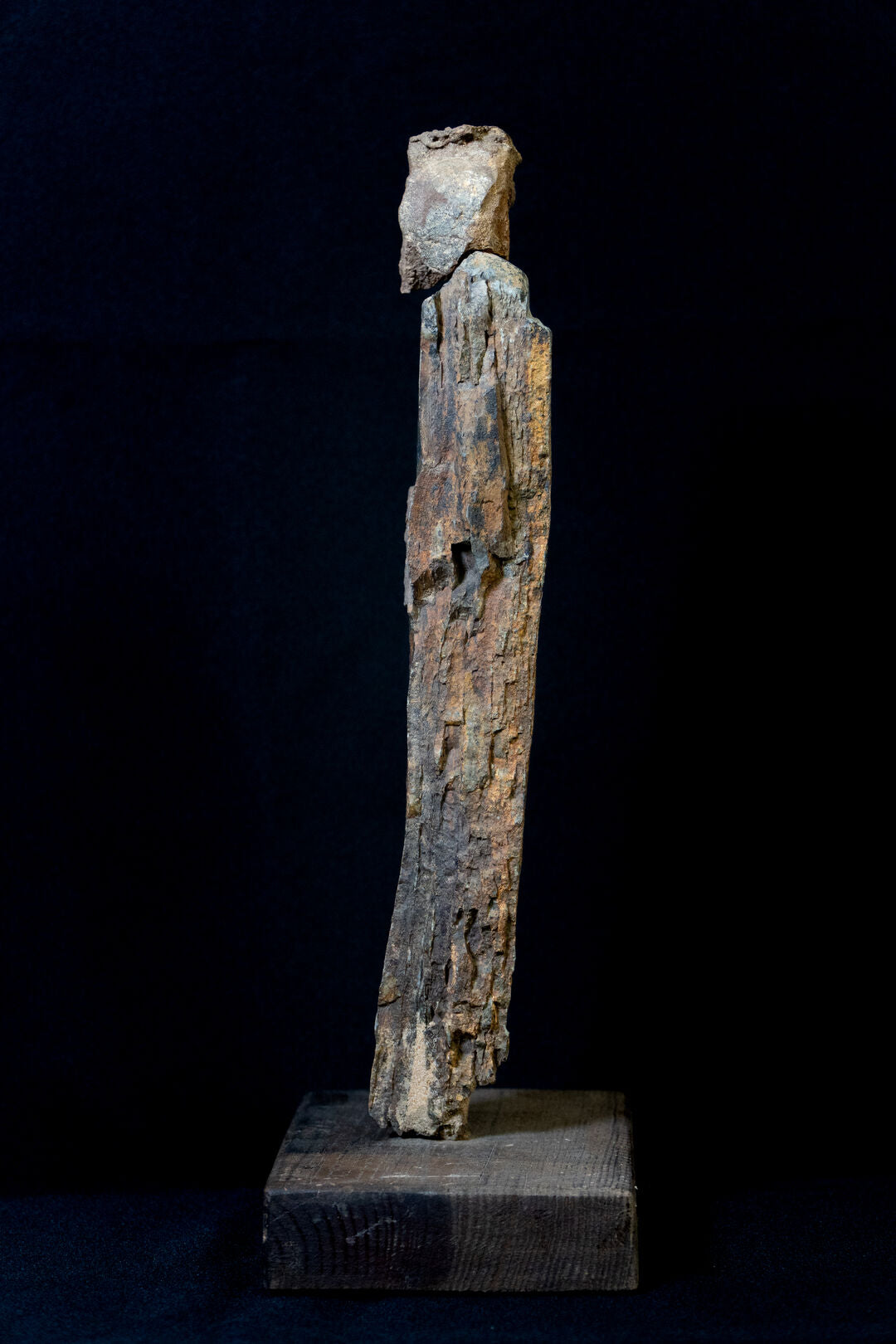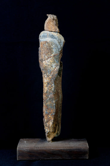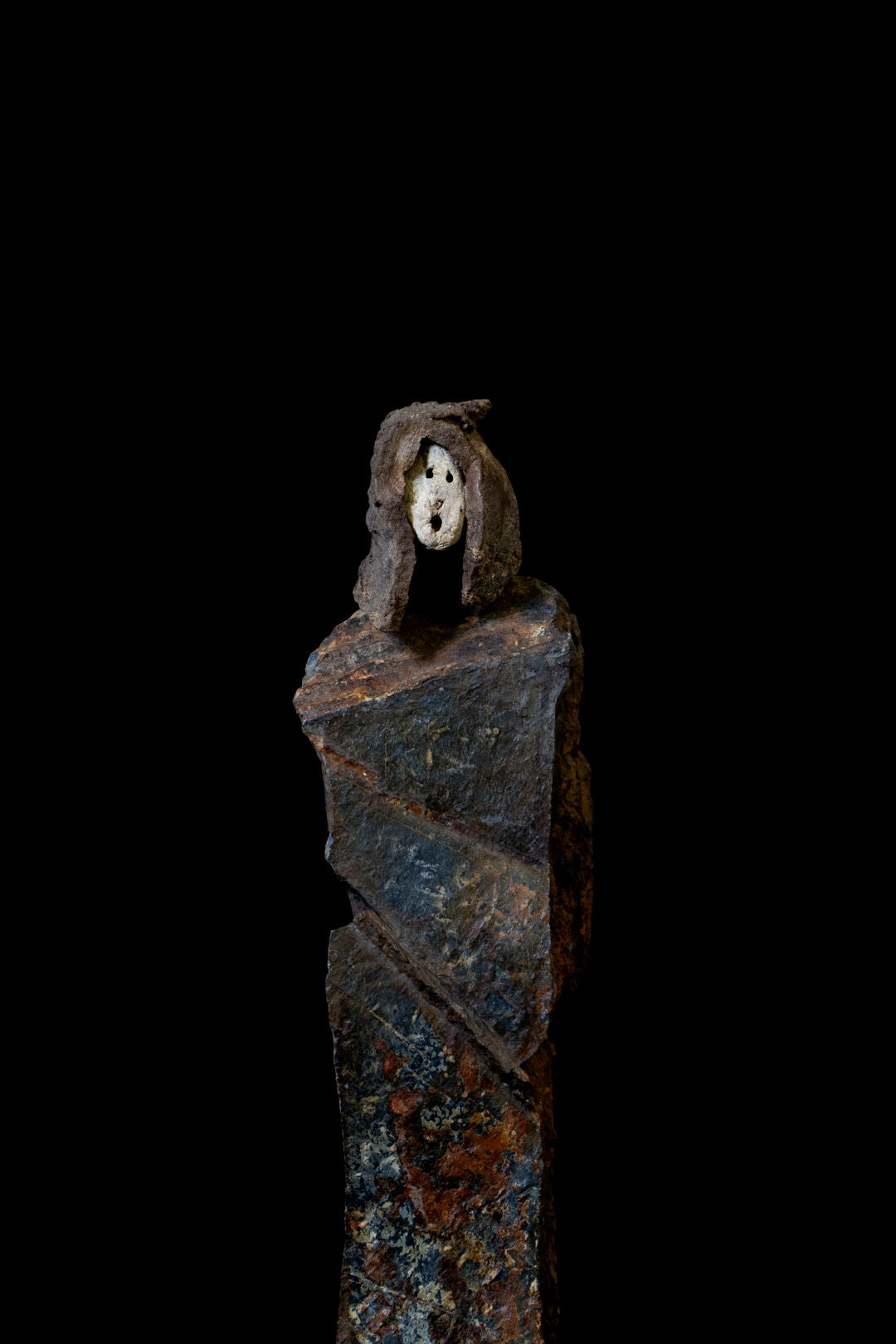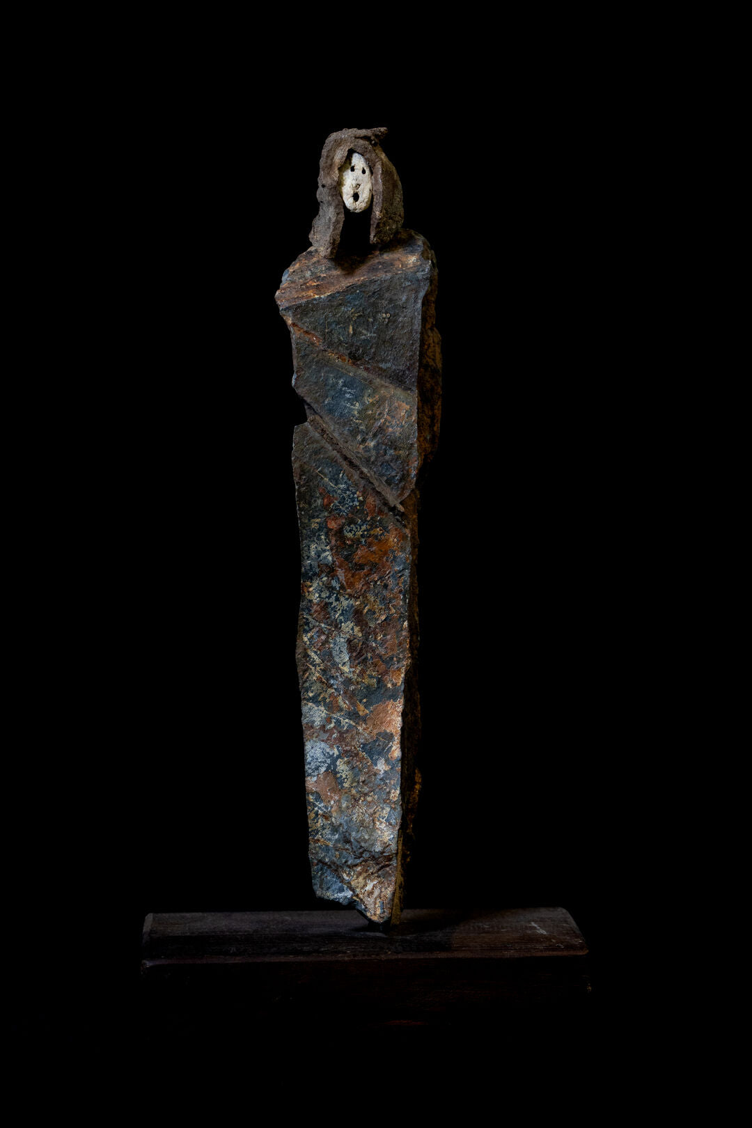 A mysterious, cloaked figure that seems to emerge from the stone itself, wrapped in an aura of silence and introspection. The rugged textures and earthy tones of the stone create an impression of timelessness, as though this figure has been a silent observer of countless epochs. Its obscured face and elongated form evoke an enigmatic presence, inviting viewers to consider the secrets and wisdom this ancient form might hold. This piece resonates with themes of solitude and quiet strength, embodying a spirit connected deeply with the elements.