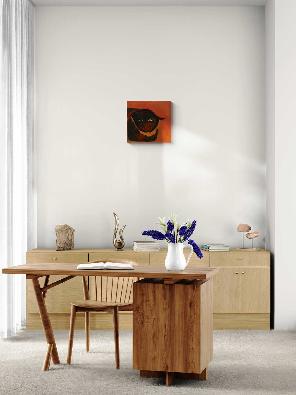 An enigmatic portrait of a beast rendered in deep, dark tones against a fiery backdrop. The minimal details and bold colors create a powerful, almost mystical presence, evoking a sense of primal energy and quiet strength.