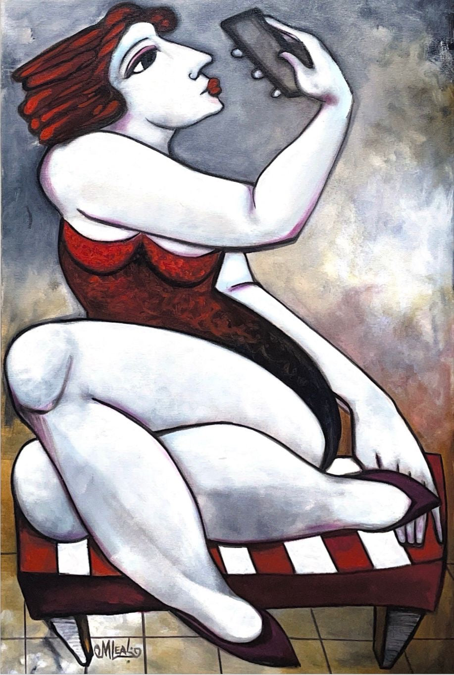 A woman in a red swimsuit sits in profile on a red and white striped bench, holding a smartphone. Her curly red hair frames her pensive face. The background is neutral with grayish tones, highlighting the central figure.