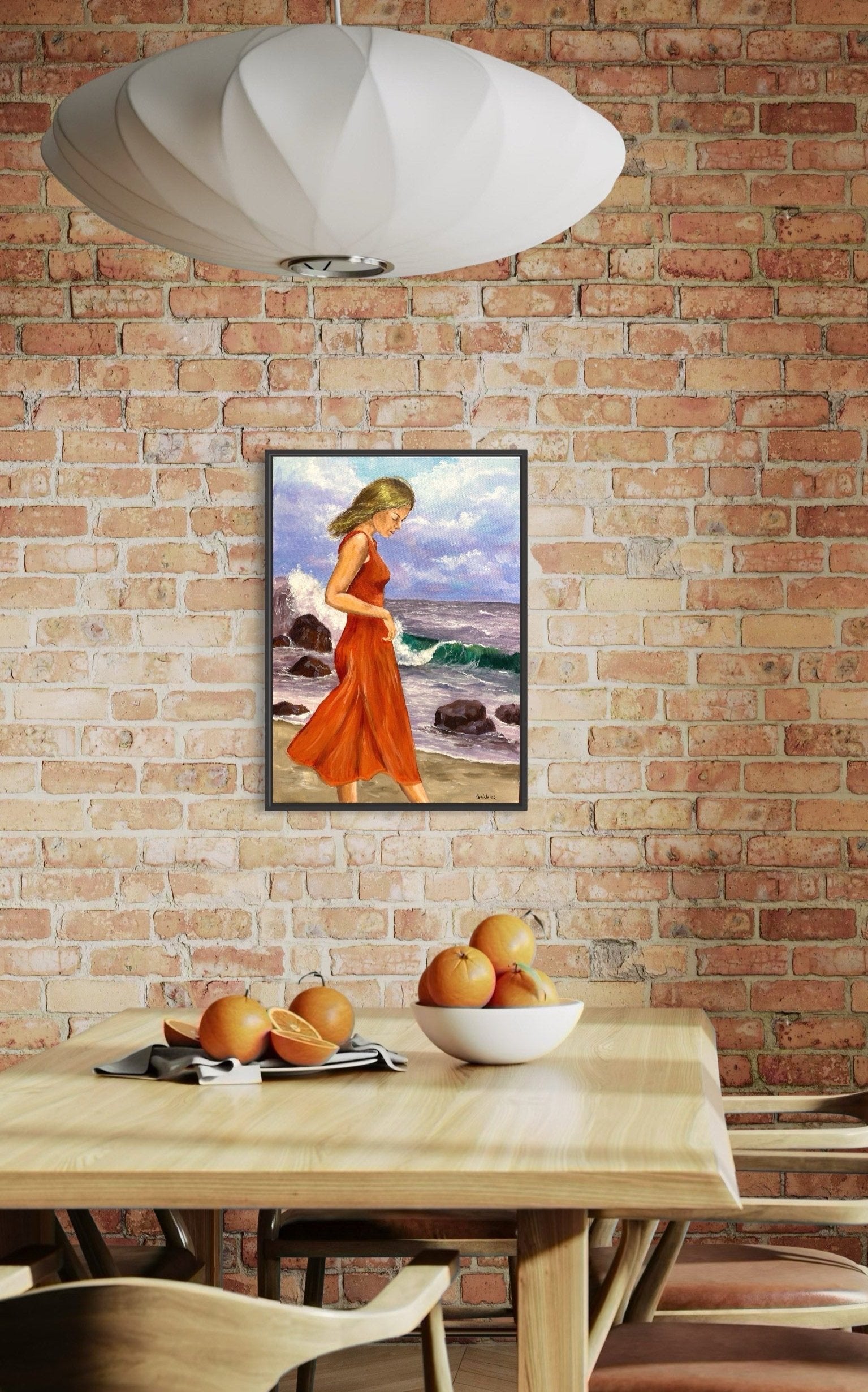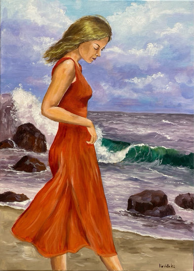 A young woman lost in thought as she strolls along a rocky shoreline, her vibrant red dress contrasting with the turbulent waves behind her. Her pensive expression and downcast gaze evoke a sense of introspection amidst the dynamic energy of the crashing surf. The painting combines the tranquility of her presence with the raw, untamed nature of the ocean, emphasizing a moment of quiet strength and resilience. This piece invites viewers to reflect on the introspective journey we all experience, standing steady amidst life’s changing tides.