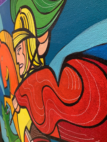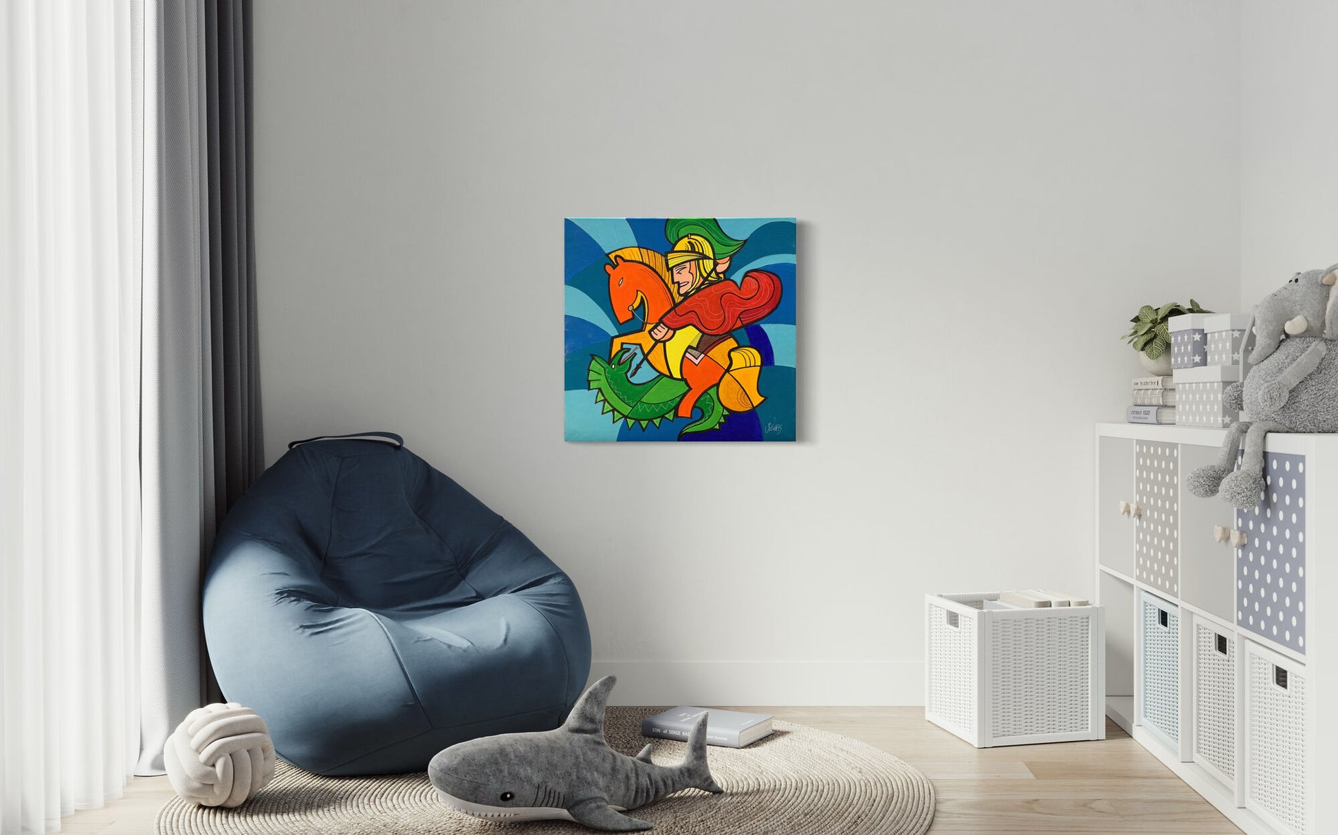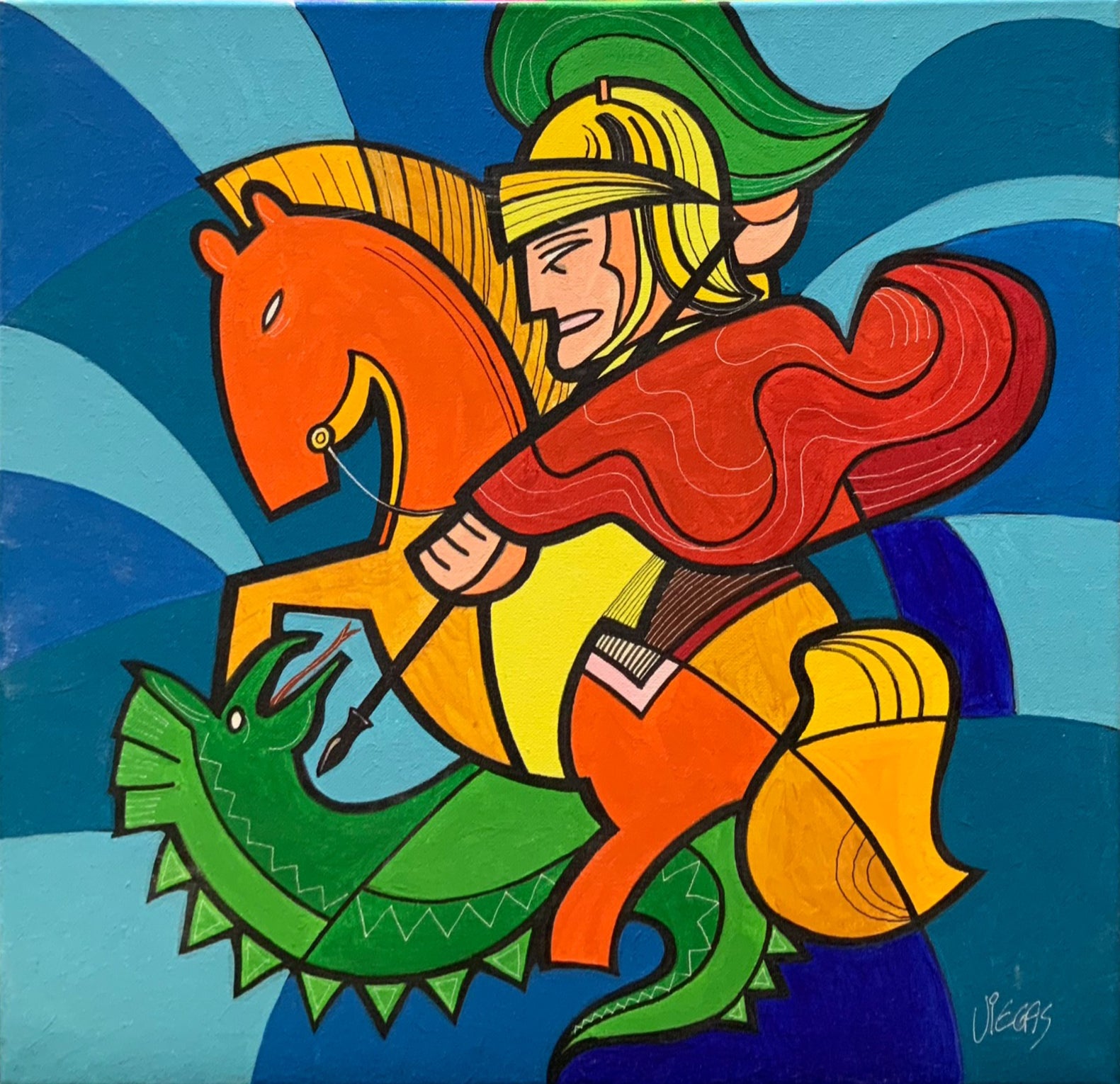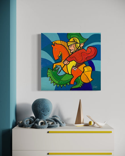 The painting depicts a stylized knight in vibrant colors, mounted on a horse, engaging in battle with a green dragon.