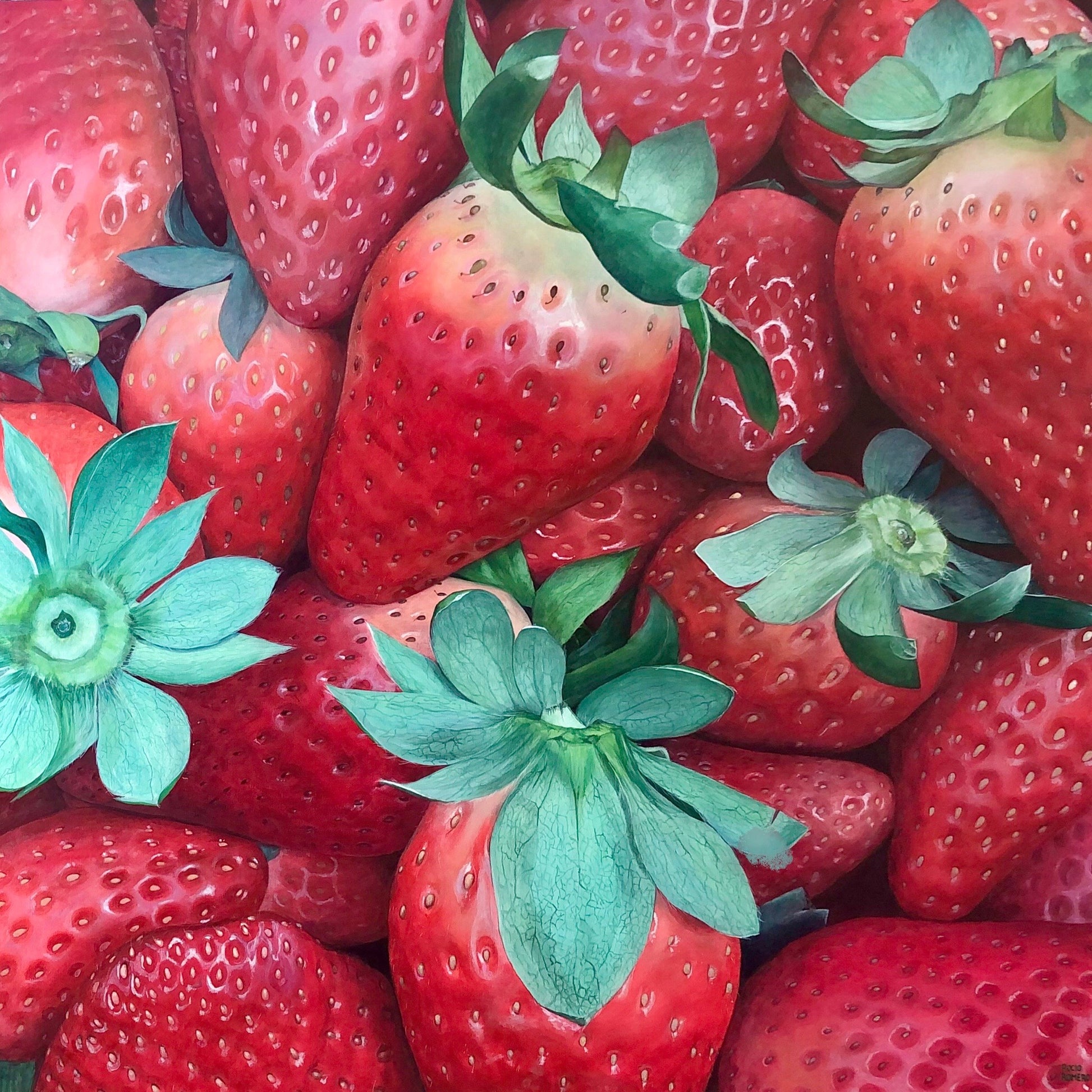 A hyper-realistic painting showcasing a vibrant collection of fresh strawberries. The detailed depiction of the glossy red fruit and the lush green leaves brings a sense of freshness and abundance.