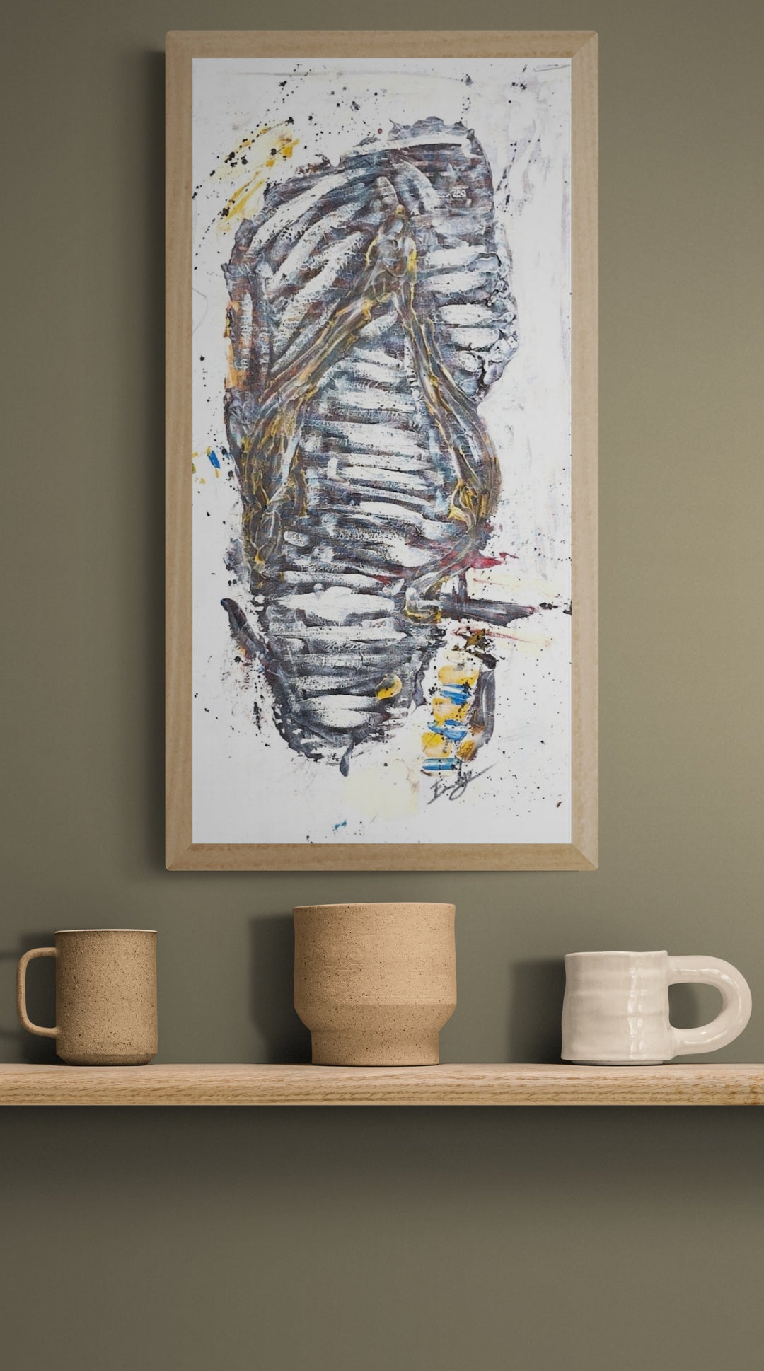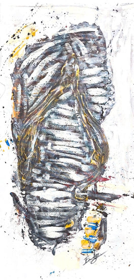 This abstract work features a central monolithic shape with alternating stripes of white, gray, and black, accented by touches of yellow and blue. The rough, textured surface and dynamic lines convey strength and resilience, while the surrounding splatters and streaks add a sense of spontaneity.