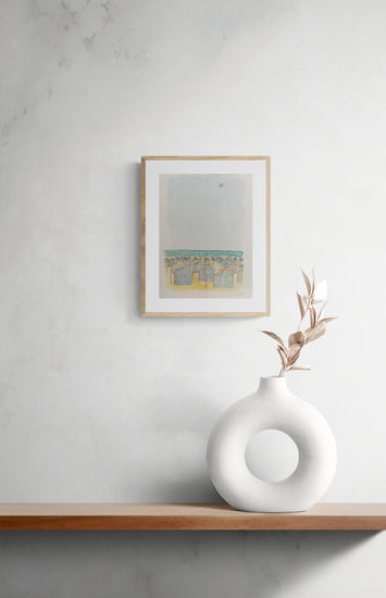 This delicate watercolor and ink artwork captures a seaside scene, where a collection of striped beach tents stretches across the sandy shore. The vivid blues and greens of the tents create a playful contrast with the soft blue sky and gentle sea in the background. One small balloon drifts calmly in the sky, adding a whimsical touch to the composition. The precise line work and subtle wash of colors evoke the peaceful charm of a summer day by the ocean, making this piece a nostalgic and serene addition to any space.