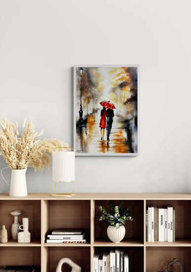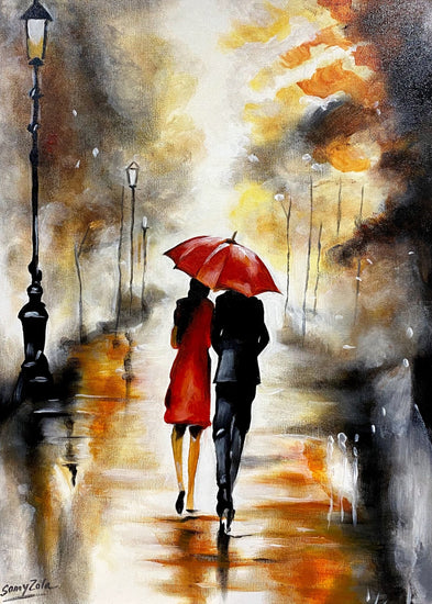 A romantic and serene moment shared by two figures walking under a single red umbrella. The couple, silhouetted in black and framed by the warm glow of streetlights, moves through a misty, rain-soaked street. The woman’s red dress and the vibrant umbrella stand out against the muted, atmospheric background of soft grays, browns, and golden reflections. The wet pavement mirrors the lamplights and adds depth, drawing viewers into this intimate scene of companionship and tranquility amidst the evening rain. This painting evokes feelings of warmth, love, and nostalgia, reminding us of the beauty in simple, shared moments.