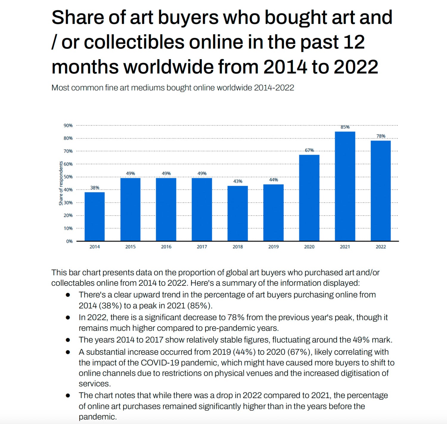Stronddo Art Gallery's "Art Market Report - Digital & Trends", built on Statista data, provided by Hiscox and ArtTactic, is an excellent illustration of how digitalisation landscape is growing in this lively field.