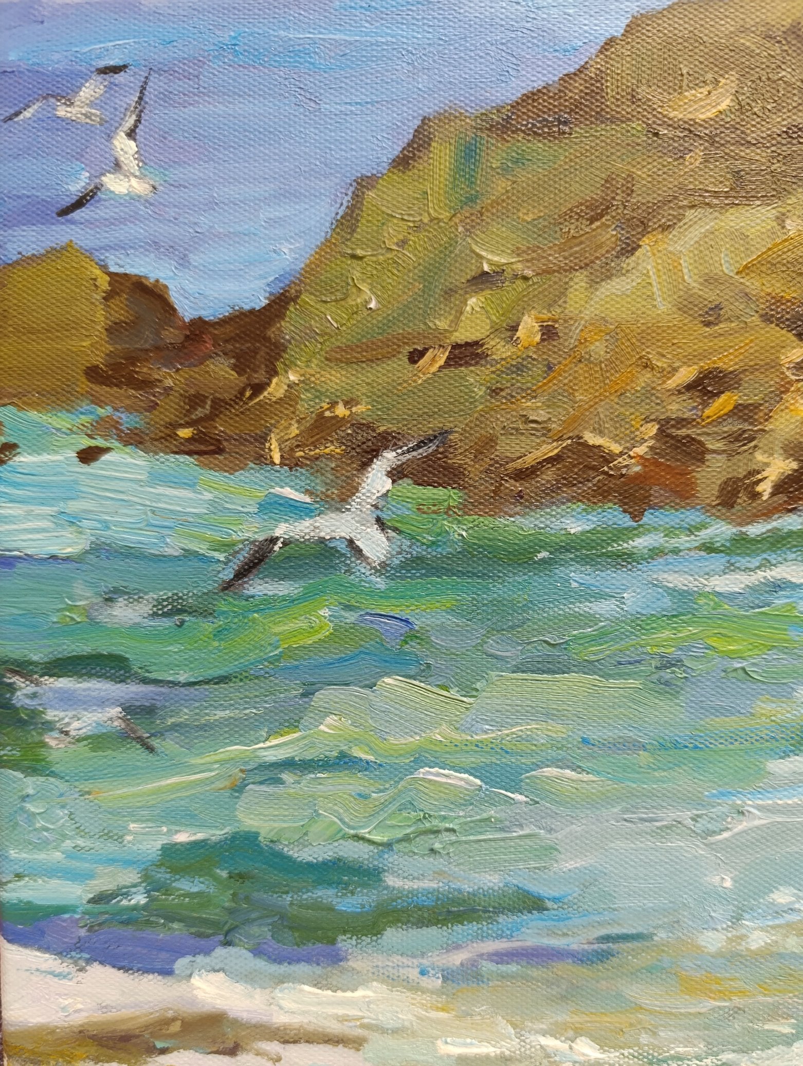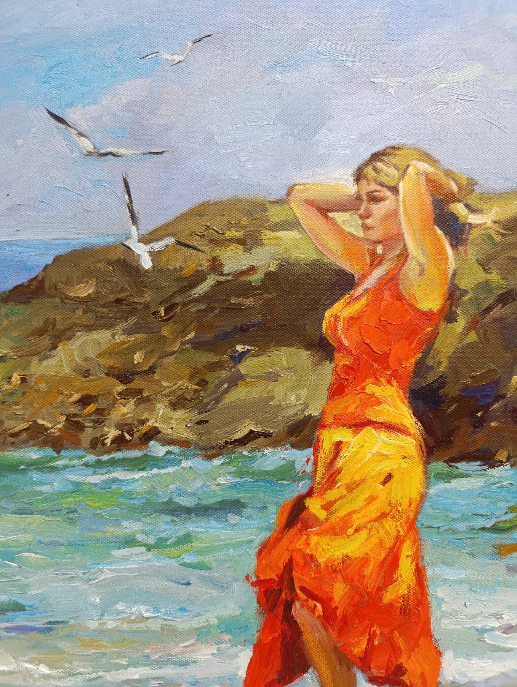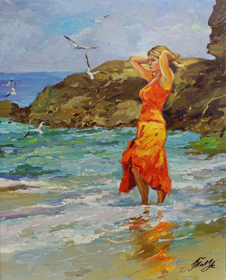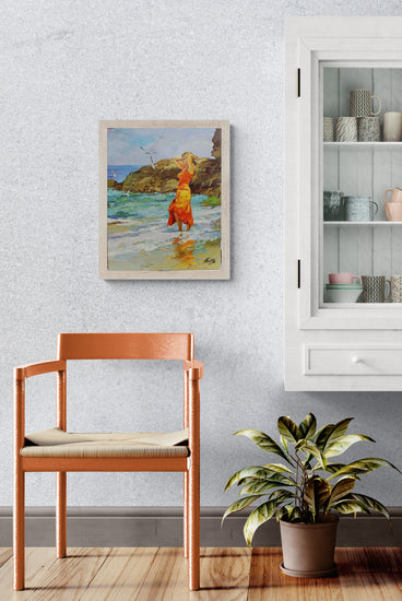 This painting captures the essence of a carefree moment by the sea, featuring a lady standing in the shallow waves, her bright dress reflecting the sunlight. The expressive brushstrokes and lively colors bring the scene to life, evoking the warmth of a summer day and the soothing sounds of the ocean. Perfect for adding a touch of coastal charm and serene energy to any space, this piece invites viewers to feel the freedom and joy of a beachside escape.