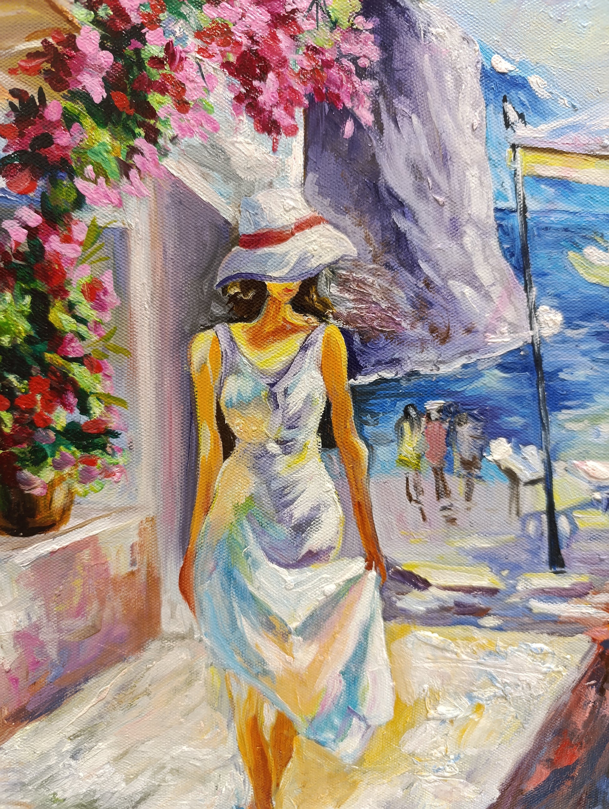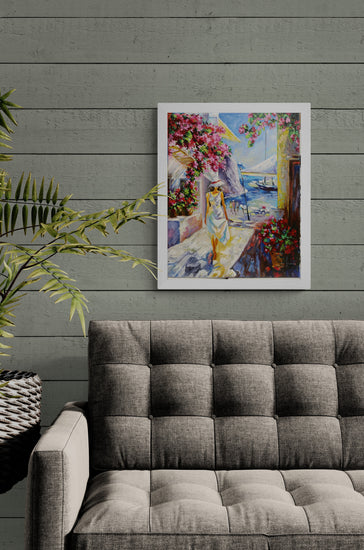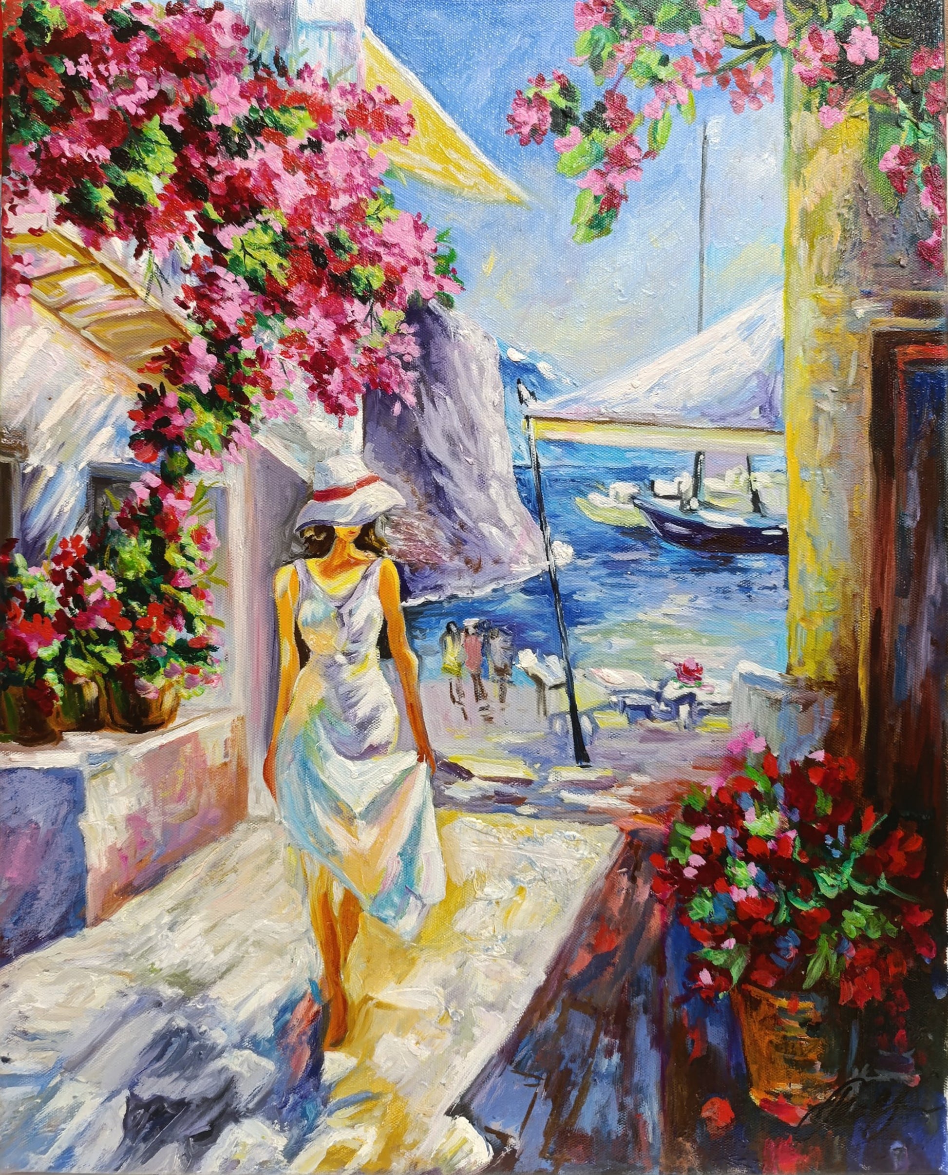 Essence of a perfect summer day along a sun-kissed coastal village. A woman in a flowing white dress walks gracefully down a bright, flower-lined path, her silhouette bathed in the warm golden light. The vibrant pink flowers cascade over the walls, contrasting beautifully with the deep blue of the sea and the distant sailboats that gently sway in the harbor. The composition, full of life and color, invites the viewer to step into this tranquil moment, where the warmth of the sun and the gentle sea breeze can almost be felt.