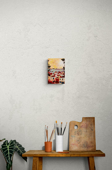 A vibrant depiction of a coastal town at sunset, with red rooftops and a golden sky. The sea glistens in the distance, framed by silhouetted foliage, capturing a serene and picturesque moment.