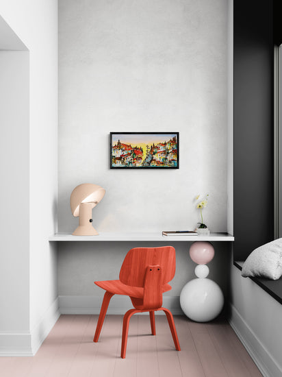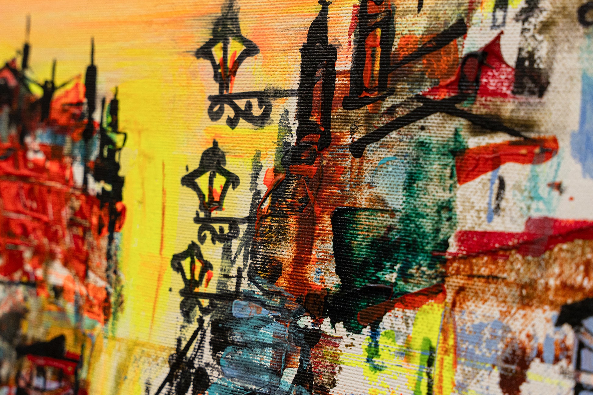 A vibrant abstract portrayal of a town at sunset, with bold brushstrokes highlighting stairways among colorful houses, and streetlamps casting a warm glow.