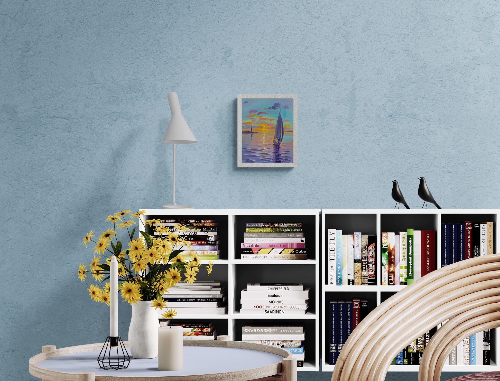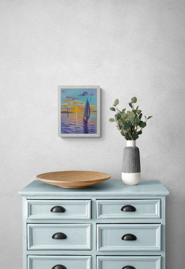 The sky is alive with rich hues of orange, pink, and blue, reflecting on the water's surface and creating a mesmerizing dance of colors. The textured brushstrokes add depth and movement, making the scene feel alive with the warmth of the setting sun. Perfect for those who love coastal landscapes and the peaceful allure of sailing, this artwork brings a touch of tranquility and adventure to any space.