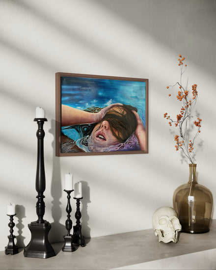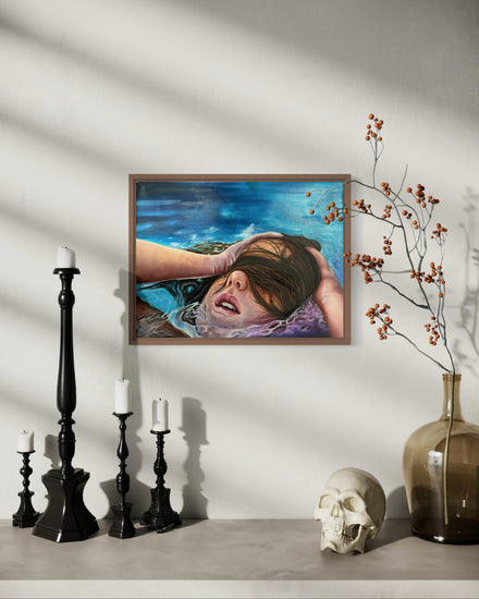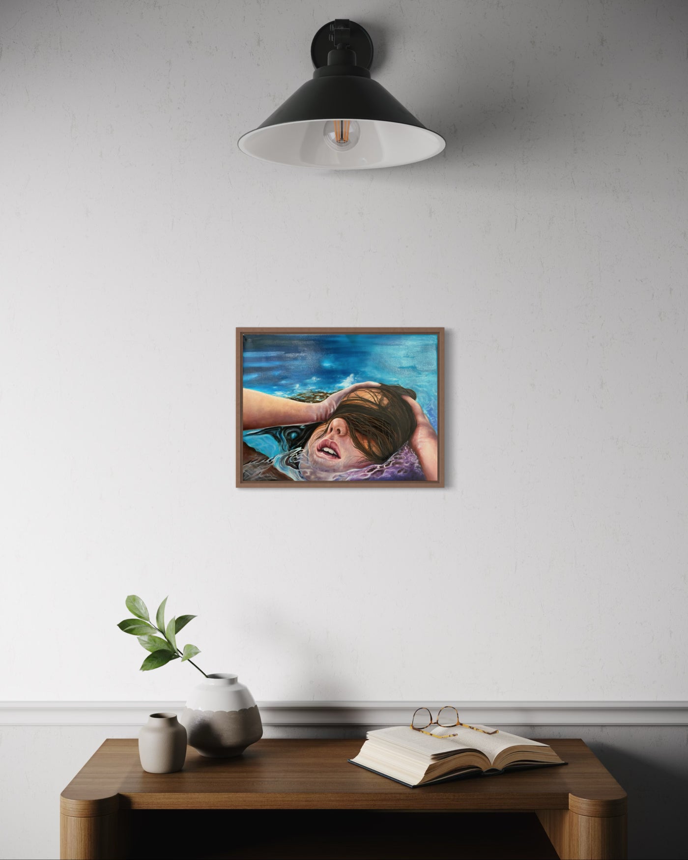 A moment of vulnerability and serenity converges in this hyper-realistic portrayal of a woman submerged in water.