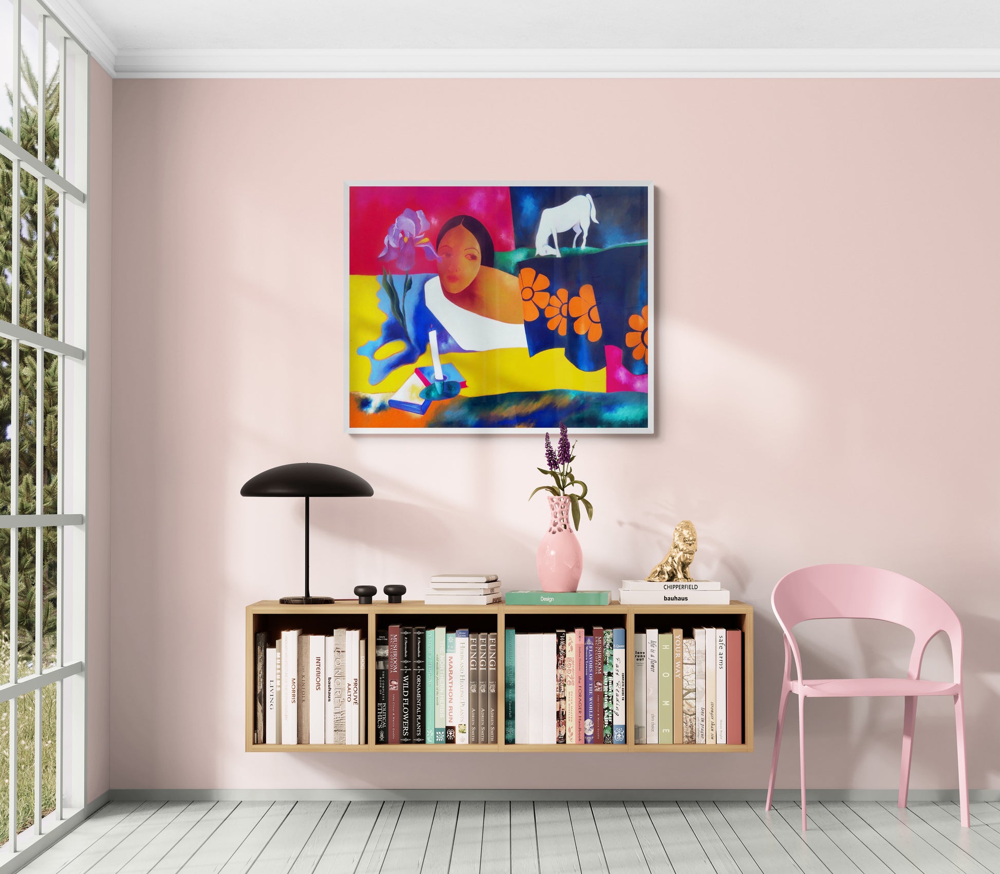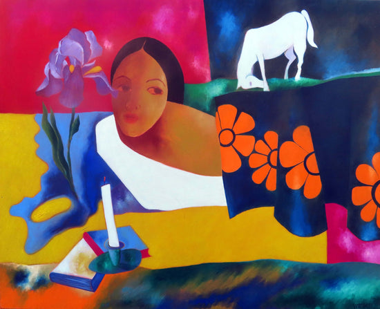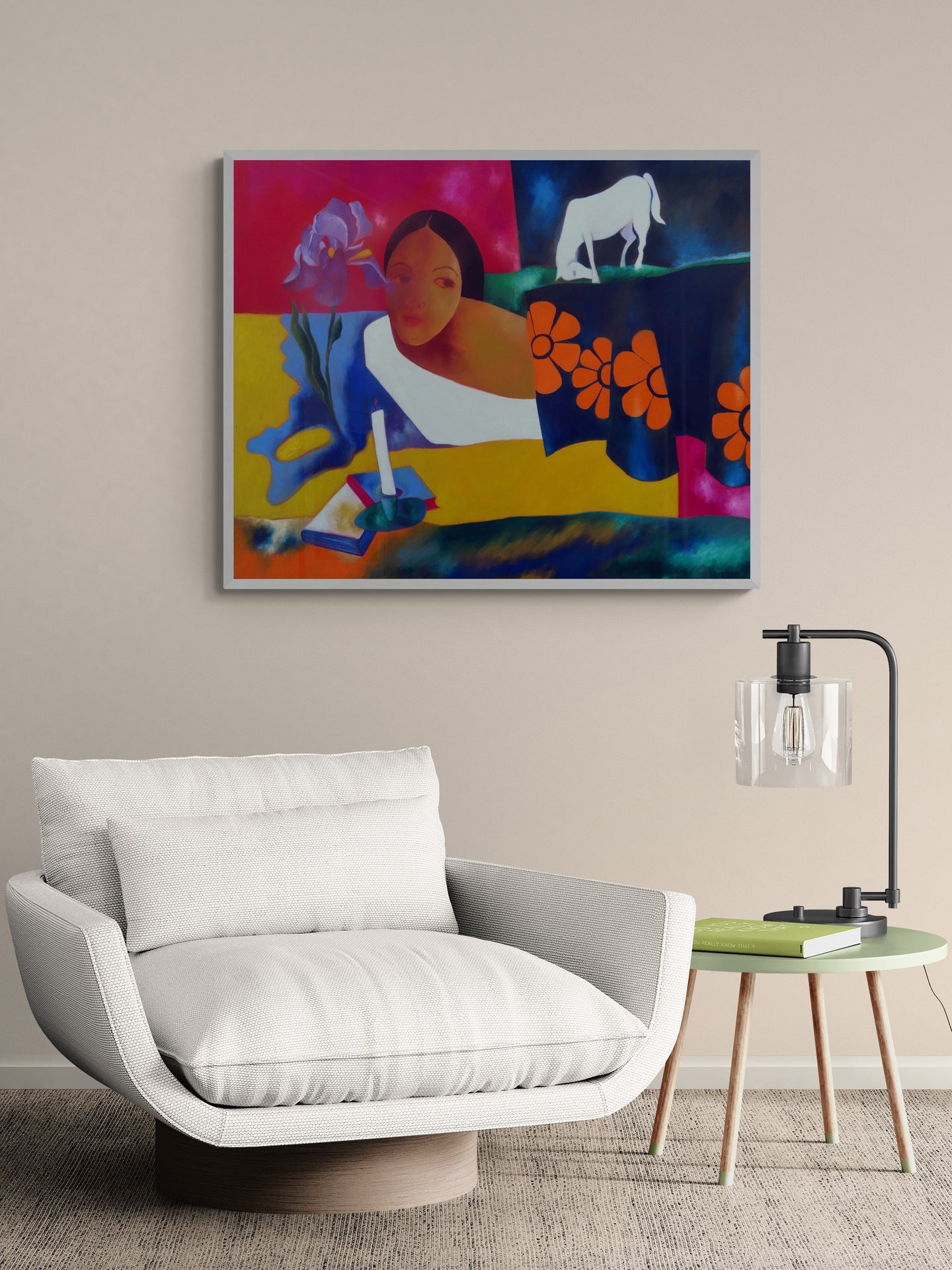 This painting invites us into a dreamlike world where reality blends with imagination. A woman’s serene face emerges from a patchwork of bright colors and symbolic elements—a delicate iris, a grazing white horse, and vivid floral patterns.