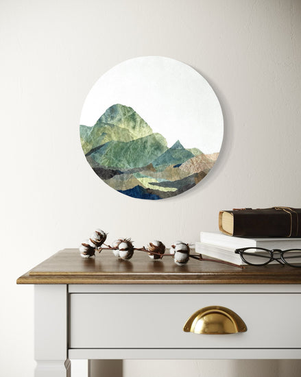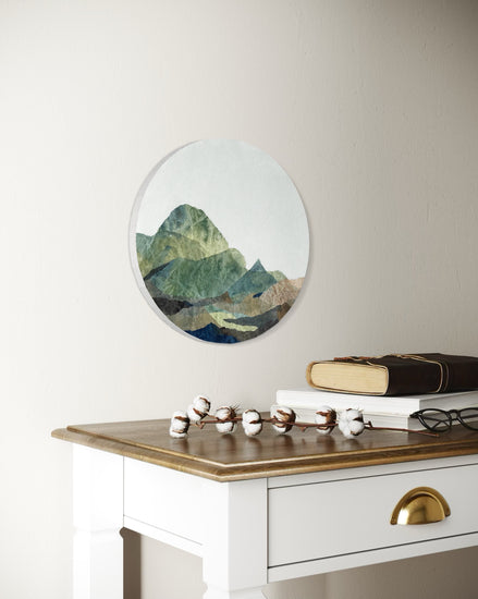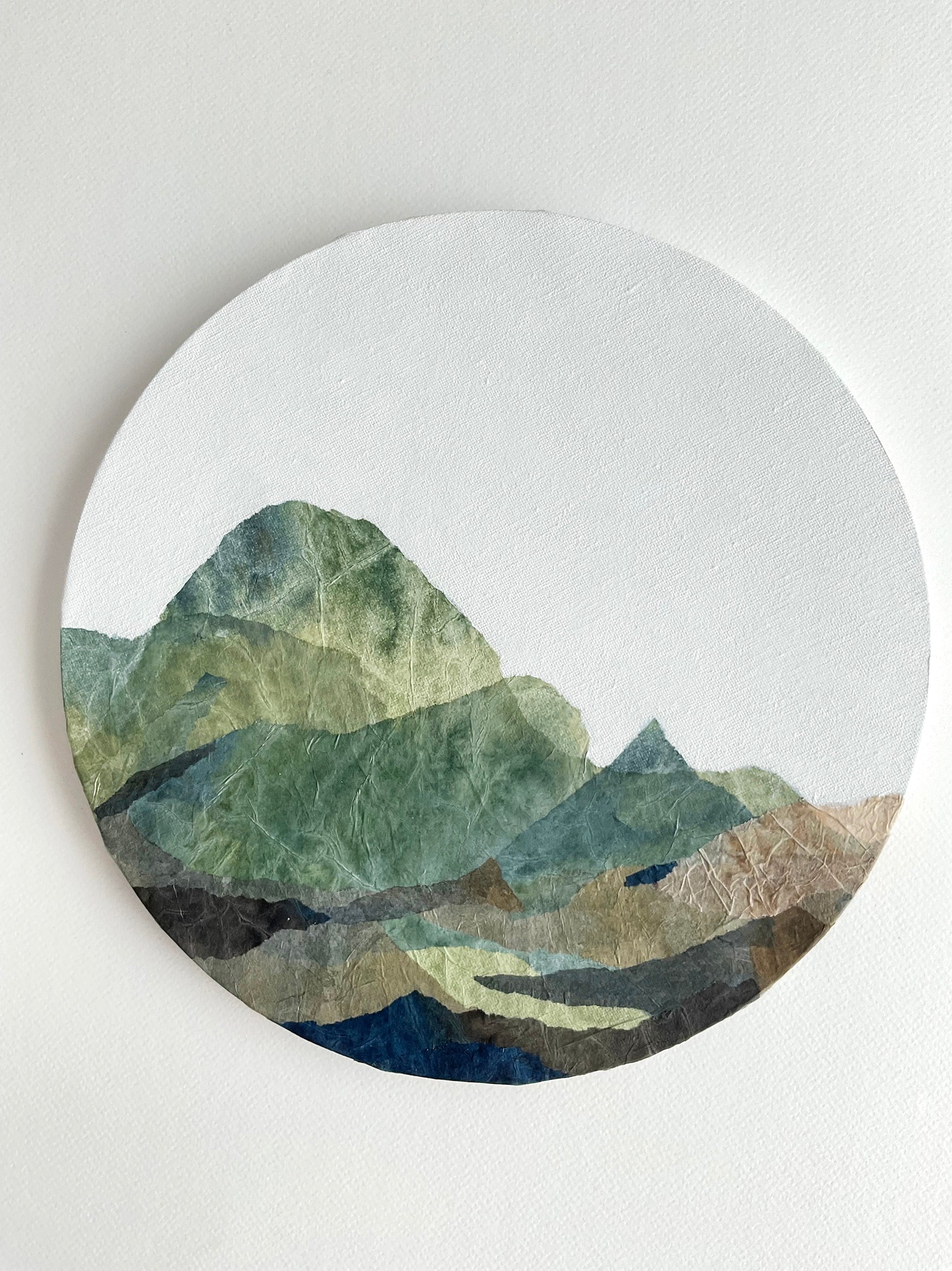 Taliscas #1 is part of the Taliscas series, which delves into tranquil, abstracted mountain landscapes through layered textures and organic hues. Created on a cotton canvas, this piece employs hand torn paper collage to capture a mountainous scene in calming greens, natural browns, and deep blues. The circular format with generous negative space enhances the textured layers, evoking the rugged beauty and quiet majesty of nature. This series reflects a minimalist aesthetic, inviting viewers to connect with the essence of landscapes in a subtle, contemplative manner.