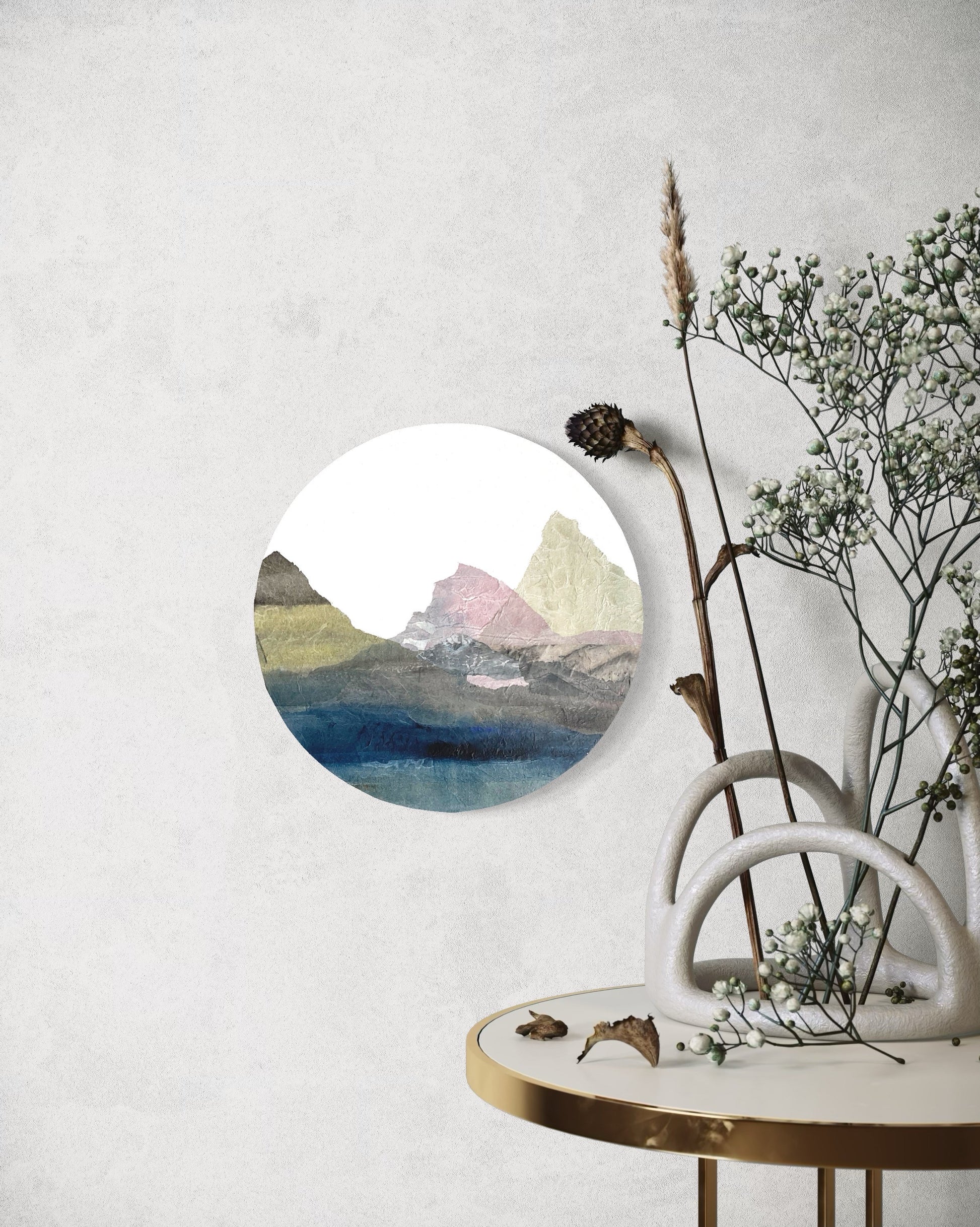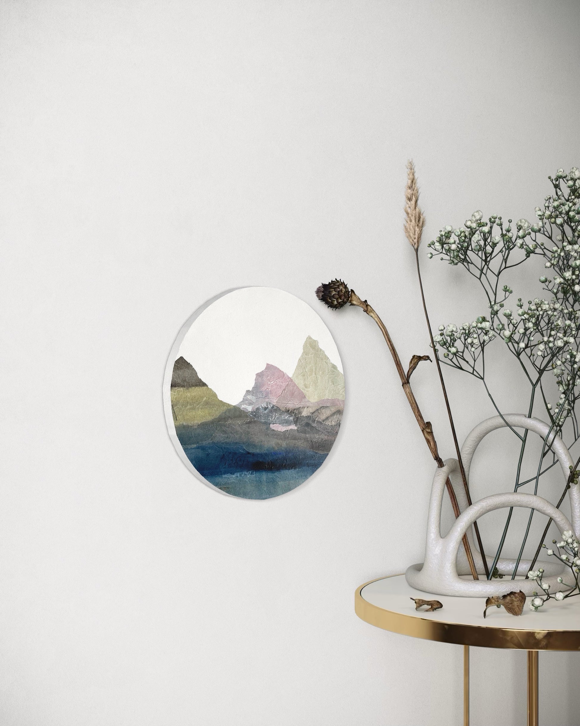 This piece belongs to the Taliscas series, a collection that captures the serene essence of mountainous landscapes through layered textures and soft, natural hues. Crafted on a round cotton canvas, this piece employs hand torn paper collage to capture a mountainous scene it reflects a minimalist yet immersive interpretation of nature. The subtle colors blend harmoniously, inviting a peaceful and contemplative viewing experience.
