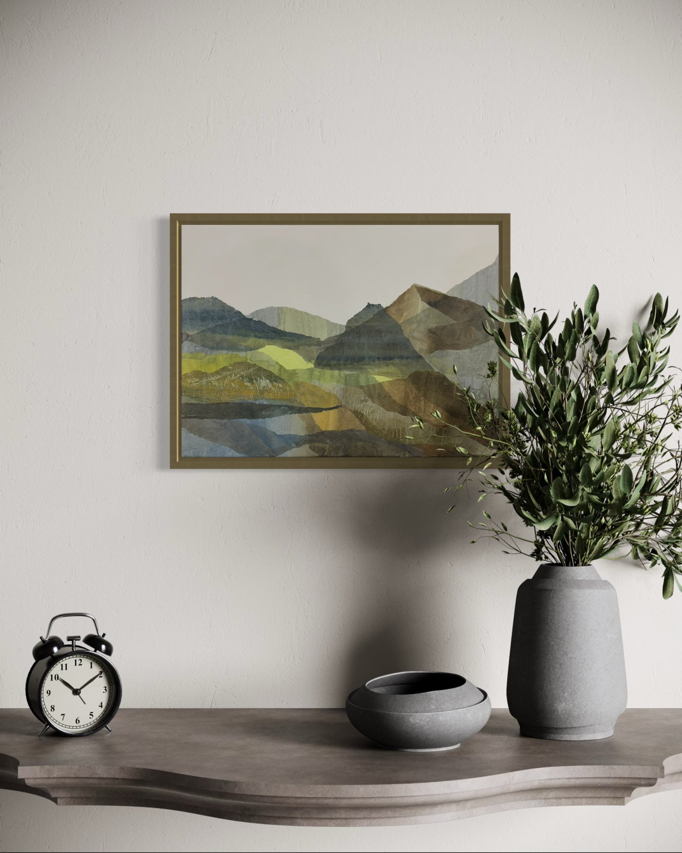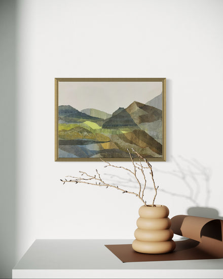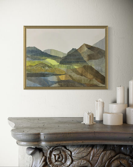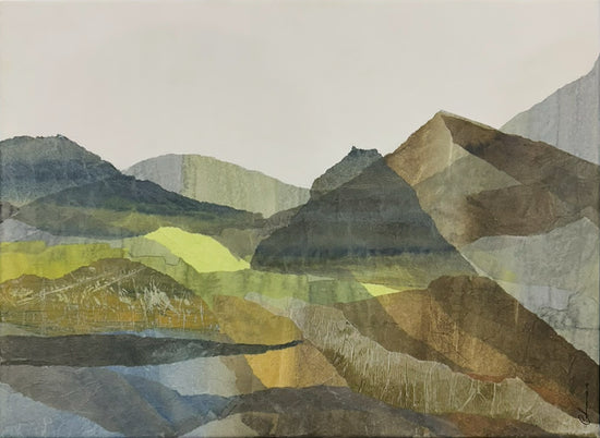 A tranquil abstract landscape composed of layered, semi-transparent papers in earthy greens and browns. The softly overlapping shapes evoke mountainous contours, creating a serene depth and harmony across the canvas.