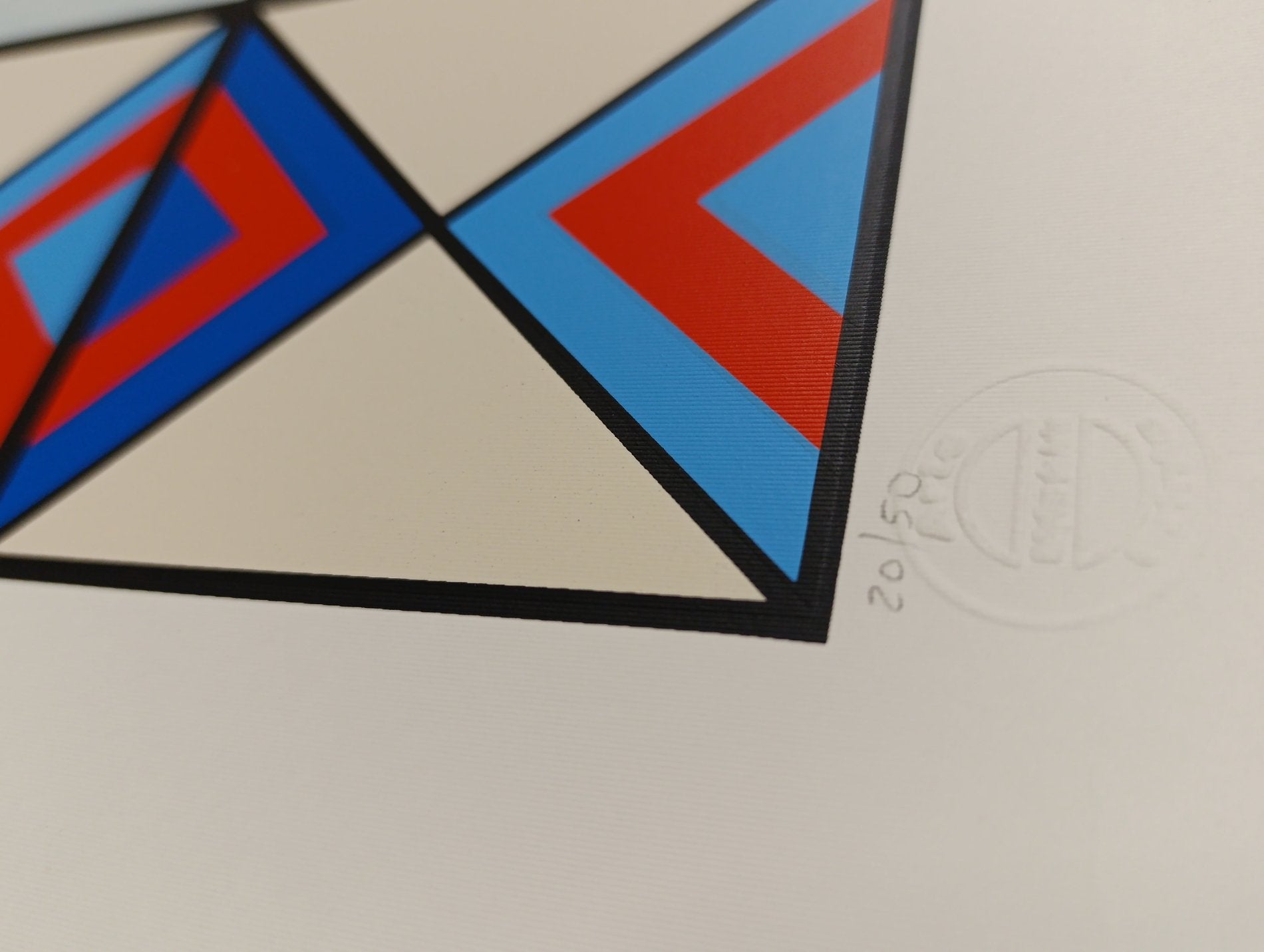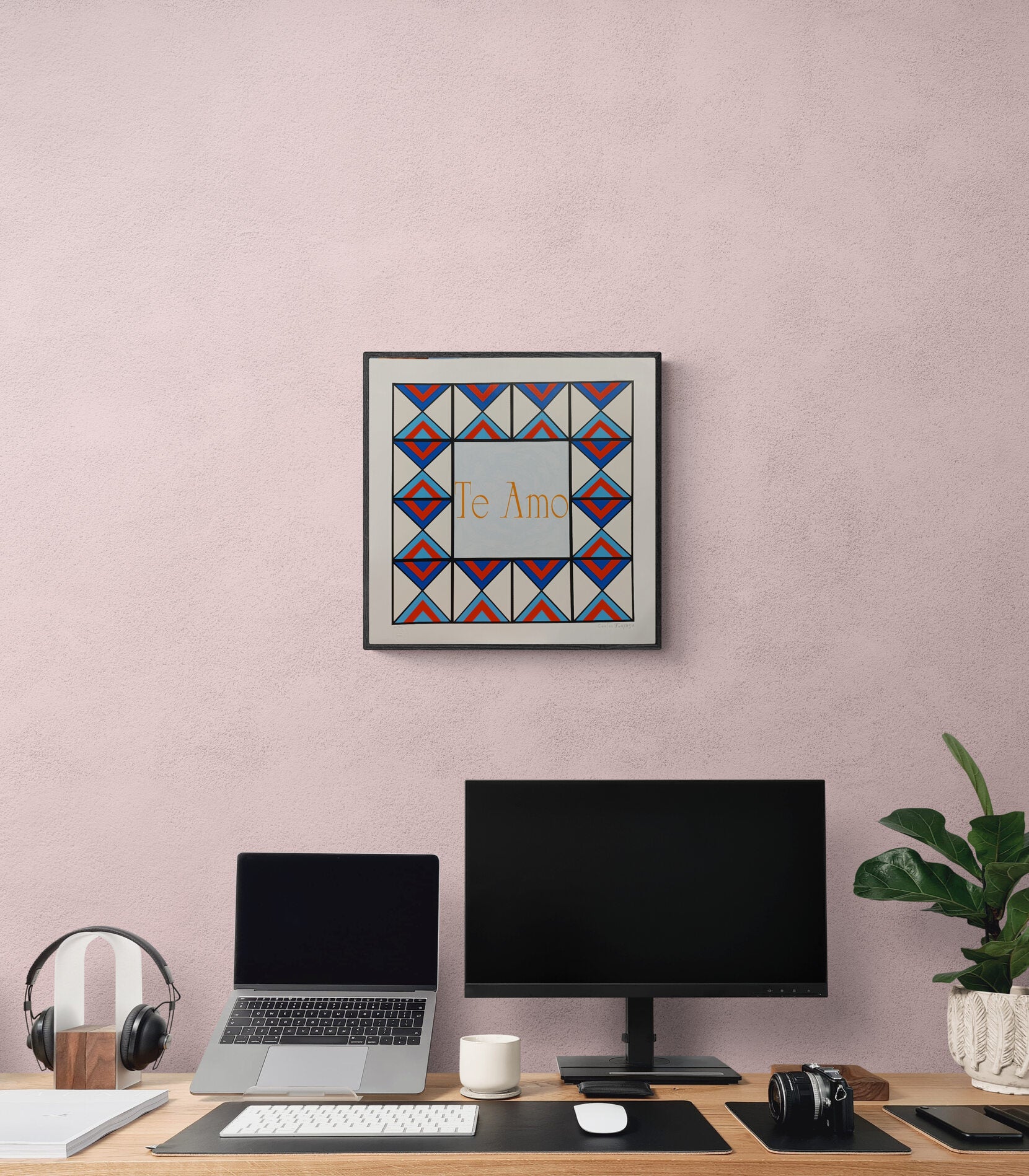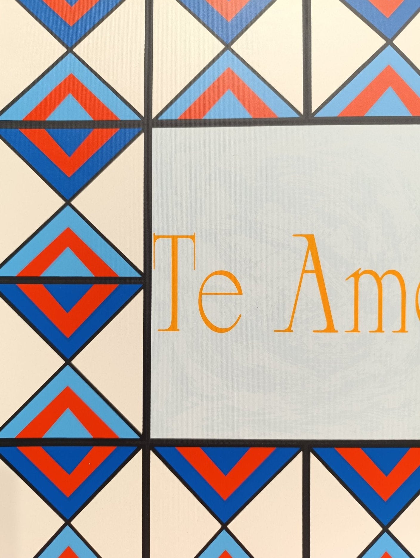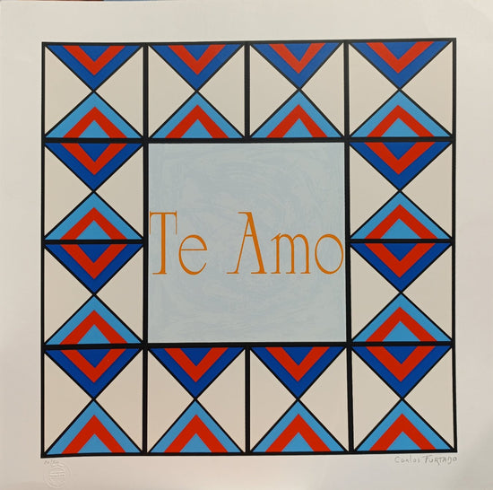 Carlos Furtado’s "Te Amo" combines geometric precision with heartfelt sentiment. The design consists of repeated triangular patterns in vibrant shades of blue and red, creating a bold frame around the central message, "Te Amo," which means "I Love You" in Spanish or Italian. This artwork blends tradition with modern design sensibilities, making it a versatile piece for any contemporary space. The symmetry and color palette evoke a sense of harmony, while the text adds an emotional depth, making it both visually appealing and meaningful.