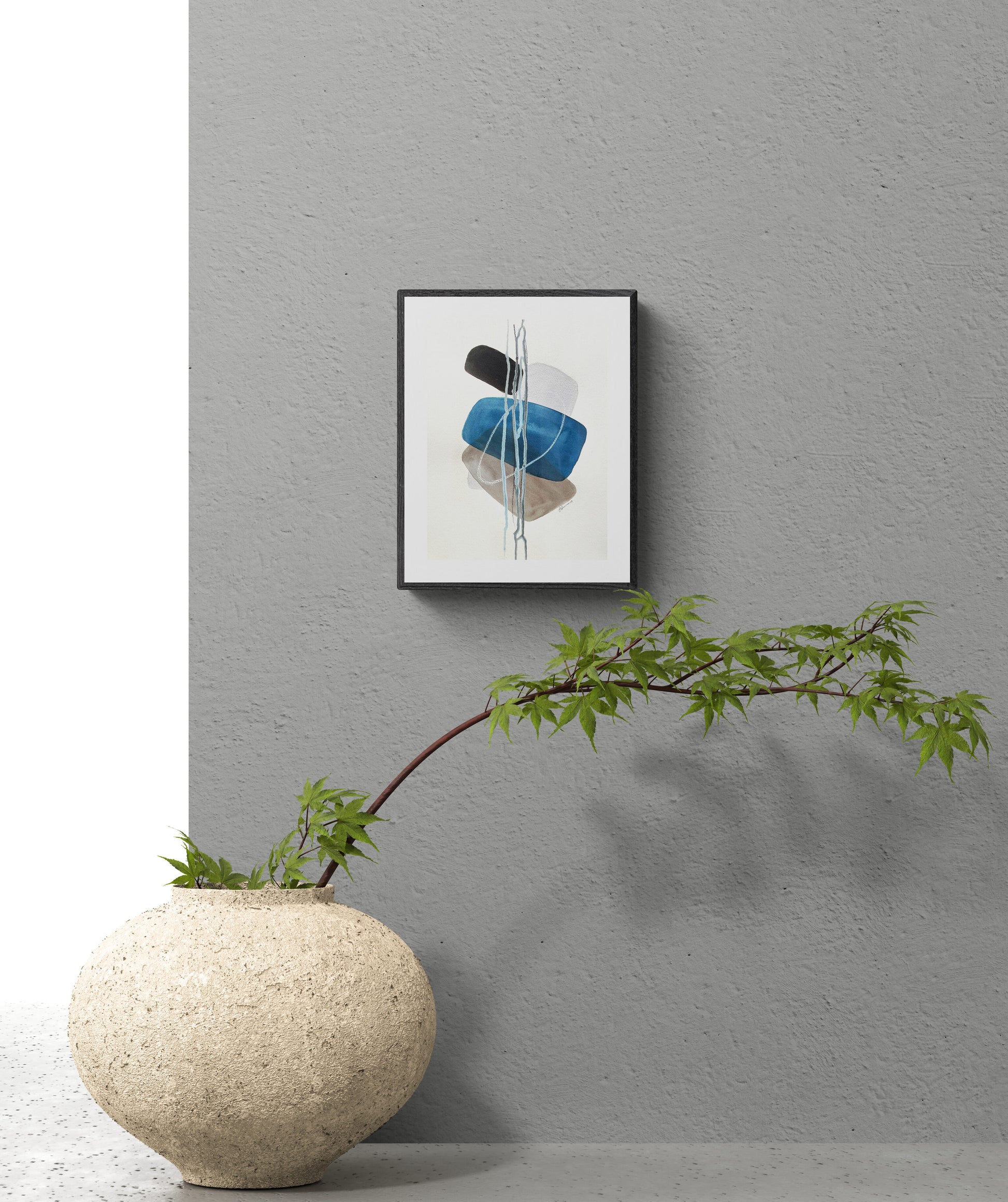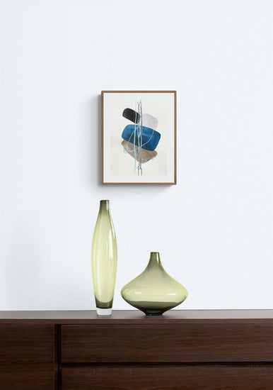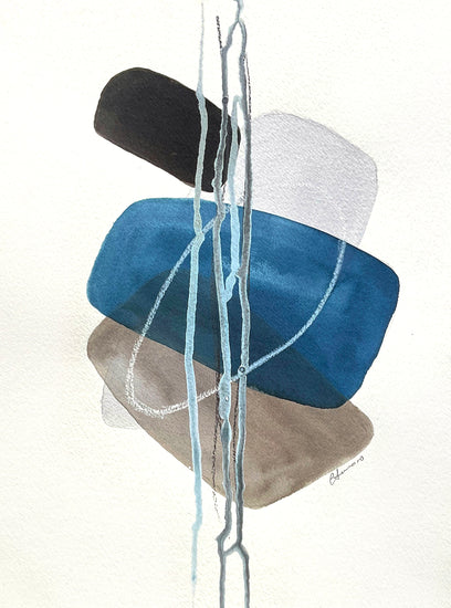 A delicate moment of equilibrium through layered, soft-edged geometric shapes. Deep blue, earthy brown, and black forms are intertwined with wispy, flowing white lines that cascade vertically, suggesting both connection and transience. The translucent overlay of shapes reveals subtle interactions, conveying an impression of harmony within imbalance. This abstract composition invites reflection on the ephemeral nature of balance in life.