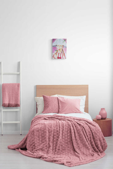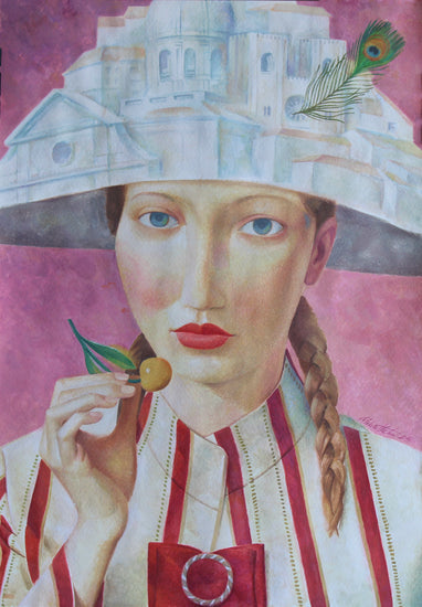 A striking portrait of a woman wearing a hat shaped like an architectural marvel, adorned with a peacock feather. The vivid colors and meticulous details highlight the fusion of human and structural beauty.