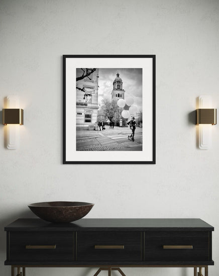 The contrast between the boy's agile movement and the cathedral's solidity evokes a sense of freedom and lightness. Each balloon seems to tell a story of dreams and hopes, while the young boy, in his playful stride, invites us to recall the simple and pure moments of life. The photograph captures not just a moment but a collective feeling of happiness, showing that even in the routines of daily life, there are reasons to smile.