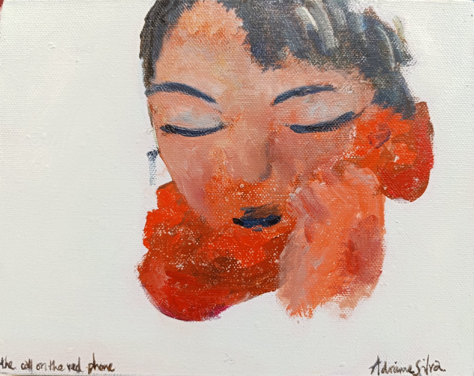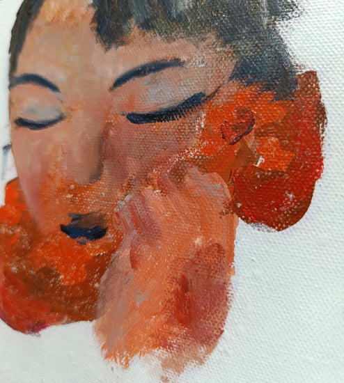 An intimate moment of contemplation or longing, as a soft portrait of a woman with closed eyes is surrounded by vivid red brushstrokes. The use of bold colors, especially the rich red, symbolizes emotional intensity or an important connection. The woman's serene expression contrasts with the dynamic textures of the red, creating a sense of internal dialogue or deep reflection. The minimal background emphasizes the emotional focus of the subject and the connection suggested by the title.