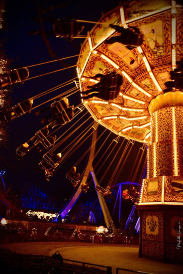 In this golden-hued photograph, we are transported to the magical world of an illuminated carousel, spinning under the vibrant lights of Liseberg Park in Gothenburg. The image captures the continuous and hypnotic motion of the suspended chairs, floating in the air and tracing circles of light against the night sky. The radiant golden lights and the soft glow emanating from every detail evoke a sense of warmth and nostalgia, reminding us of childhood and carefree moments of joy.
