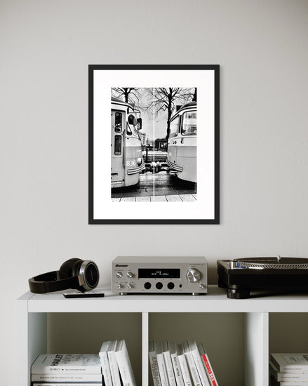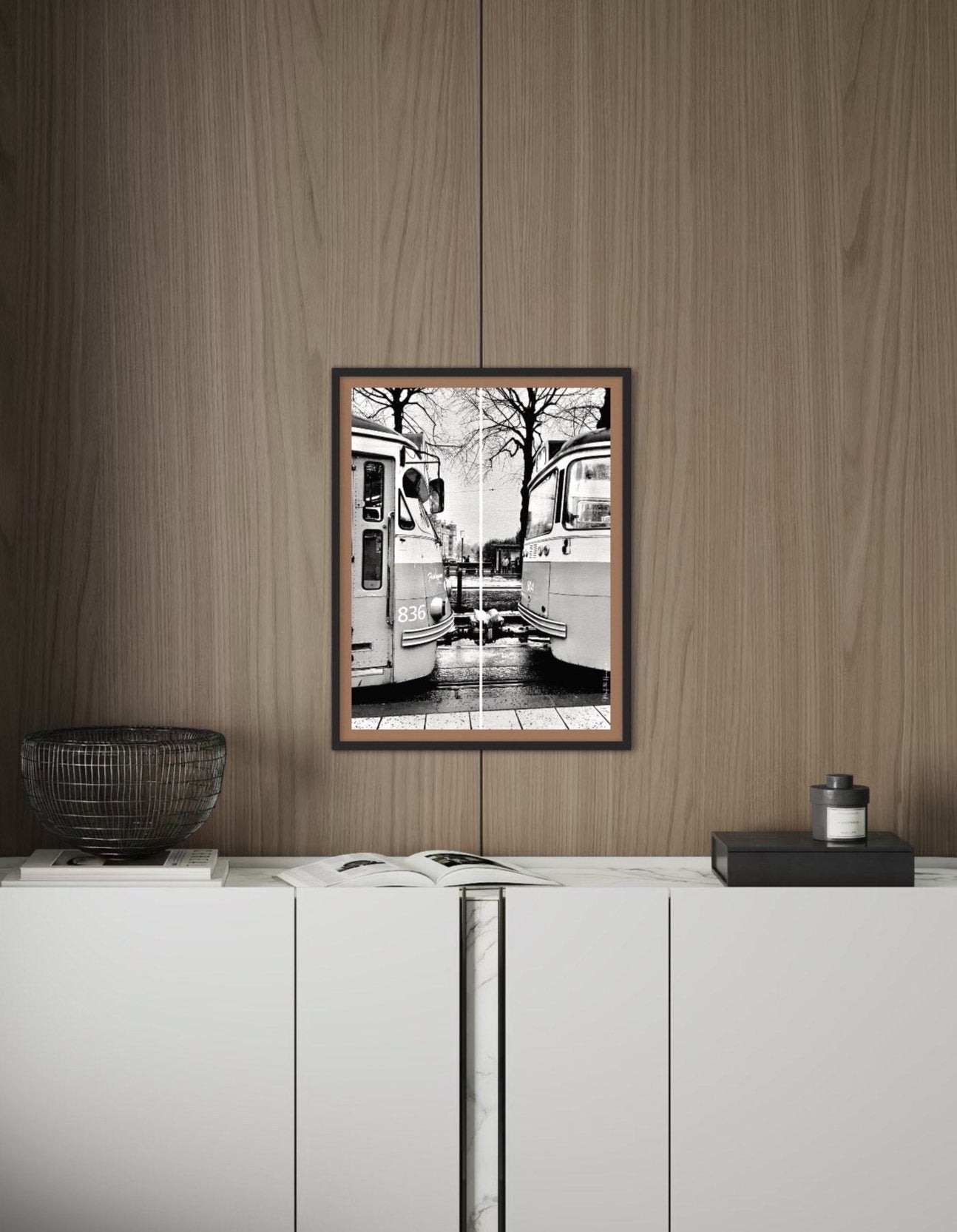 The contours of the trams, aged and robust, transport the viewer to a time when urban rhythms were slower, where encounters like this were part of daily life. The line between the trams creates a visual tension: are they meeting or parting? This small empty space symbolizes a fleeting moment of closeness but also separation, as if they were destined to travel parallel paths, never truly touching.