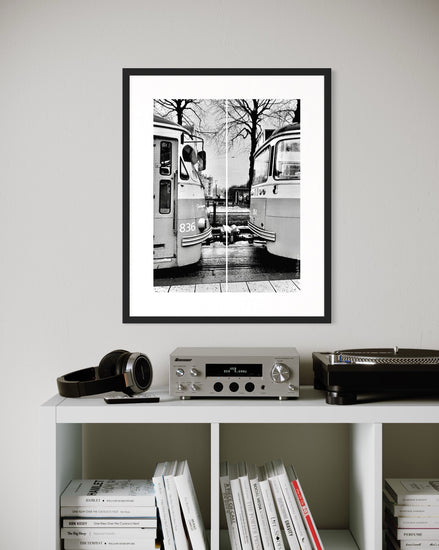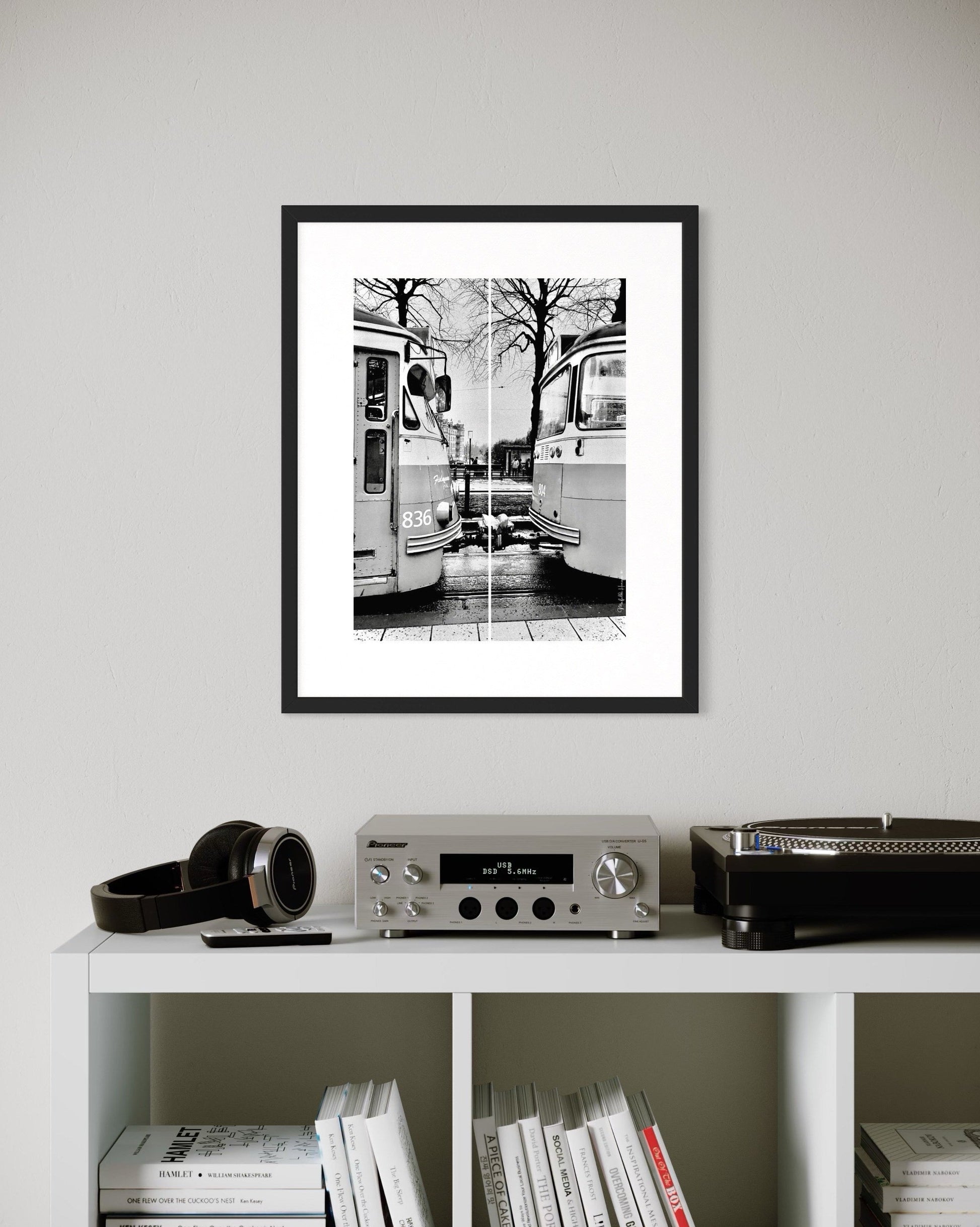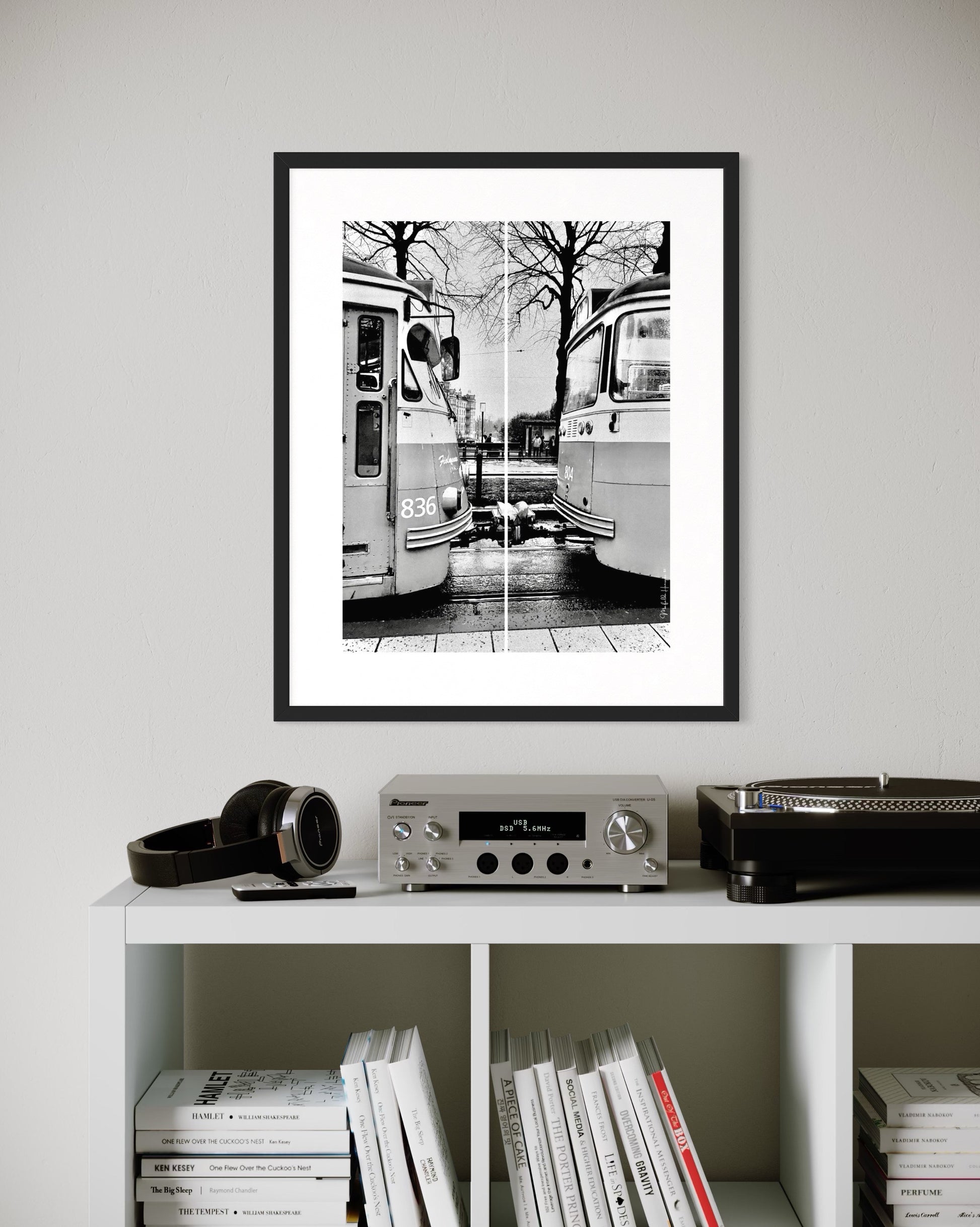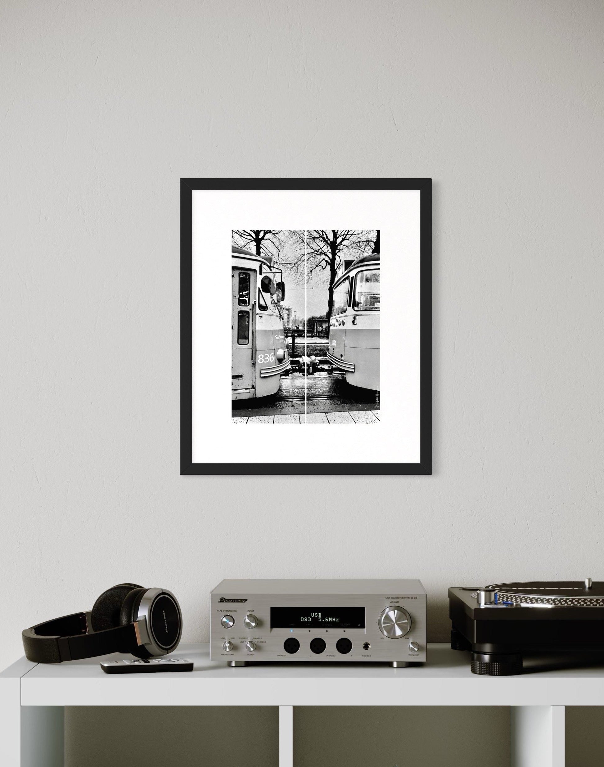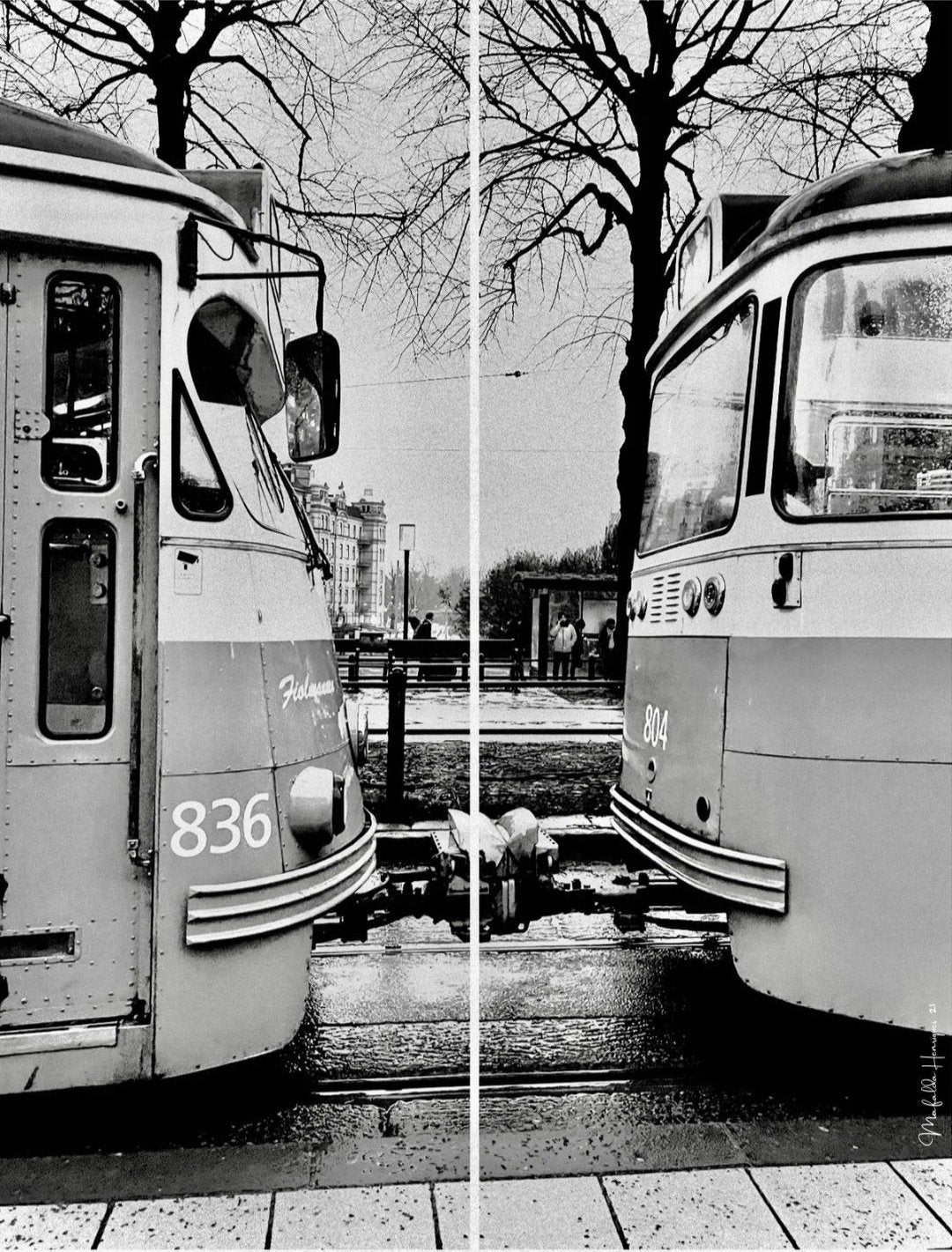 This black-and-white photograph captures a moment of urban symmetry, an instant where two trams face each other, separated by an almost imperceptible line. The contrasting numbers on their sides, "836" and "804," mark the unique identity of each vehicle, while the background, devoid of color, evokes a melancholic and nostalgic city, almost as if suspended in a bygone era.